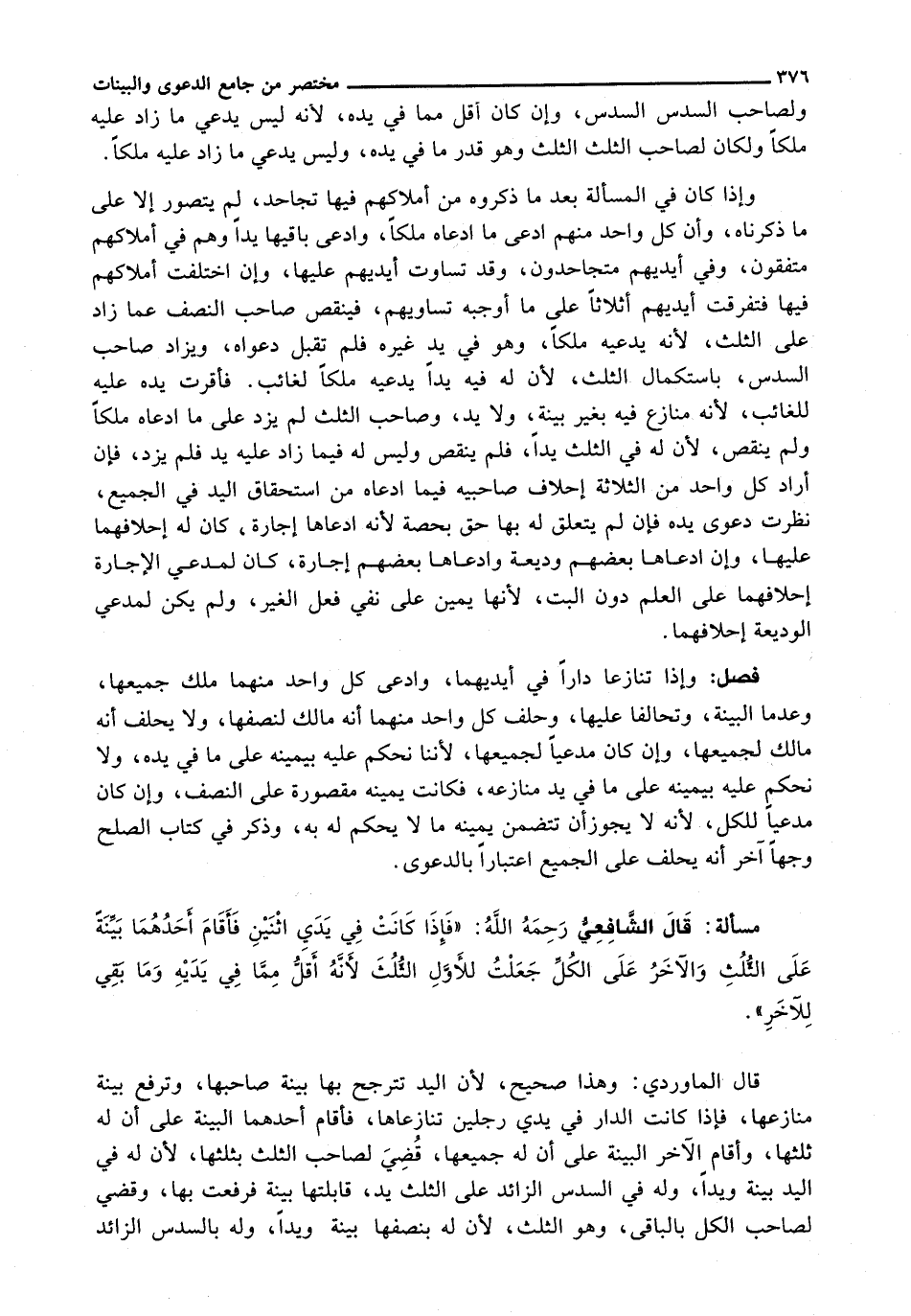 قَالَ الْمَاوَرْدِيُّ: وَهَذَا صَحِيحٌ، لِأَنَّ الْيَدَ تَتَرَجَّحُ بِهَا بَيِّنَةُ صَاحِبِهَا، وَتُرْفَعُ بَيِّنَةُ مُنَازِعِهَا، فَإِذَا كَانَتِ الدَّارُ فِي يَدَيْ رَجُلَيْنِ تَنَازَعَاهَا، فَأَقَامَ أَحَدُهُمَا الْبَيِّنَةَ عَلَى أَنَّ لَهُ ثُلُثَهَا، وَأَقَامَ الْآخَرُ الْبَيِّنَةَ عَلَى أَنَّ لَهُ جَمِيعَهَا، قُضِيَ لِصَاحِبِ الثُّلُثِ بِثُلُثِهَا، لِأَنَّ لَهُ فِي الْيَدِ بينة ويدا، وله في السدس الزائدة عَلَى الثُّلُثِ يَدٌ، قَابَلَتْهَا بَيِّنَةٌ فَرُفِعَتْ بِهَا، وَقُضِيَ لِصَاحِبِ الْكُلِّ بِالْبَاقِي، وَهُوَ الثُّلُثُ، لِأَنَّ لَهُ بِنِصْفِهَا بَيِّنَةً وَيَدًا، وَلَهُ بِالسُّدُسِ الزَّائِدِ
