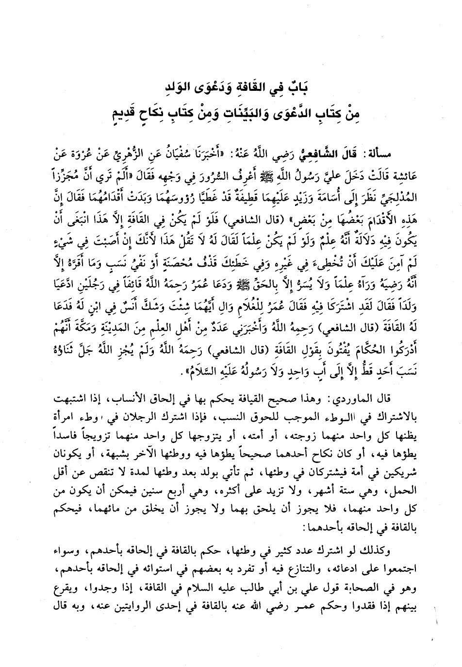 : قال الشافعي رضي الله عنه: " أَخْبَرَنَا سُفْيَانُ عَنِ الزُّهْرِيِّ عَنْ عُرْوَةَ عَنْ عَائِشَةَ قَالَتْ دَخَلَ عَلَيَّ رَسُولُ اللَّهِ - صَلَّى اللَّهُ عَلَيْهِ وَسَلَّم َ - أعرف السرور في وَجْهِهِ فَقَالَ " أَلَمْ تَرَي أَنْ مُجَزِّزًا الْمُدْلِجِيَّ نَظَرَ إِلَى أُسَامَةَ وَزَيْدٍ عَلَيْهِمَا قَطِيفَةٌ قَدْ غَطَّيَا رُؤُوسَهُمَا وَبَدَتْ أَقْدَامُهُمَا فَقَالَ إِنَّ هَذِهِ الْأَقْدَامِ بَعْضُهَا مِنْ بَعْضٍ " (قَالَ الشَّافِعِيُّ) فَلَوْ لَمْ يَكُنْ فِي الْقَافَةِ إِلَّا هَذَا انْبَغَى أَنْ يَكُونَ فِيهِ دَلَالَةٌ أَنَّهُ عِلْمٌ وَلَوْ لَمْ يَكُنْ عِلْمًا لَقَالَ لَهُ لَا تَقُلْ هَذَا لِأَنَّكَ إِنْ أَصَبْتَ فِي شَيْءٍ لَمْ آمن عليك أن تخطىء في غيره وفي خطئك قذف محصنة أو نفي نسب وما أقره إلا أنه رضيه ورآه علما ولا يسر إلا بالحق - صَلَّى اللَّهُ عَلَيْهِ وَسَلَّم َ - ودعا عمر رحمه الله قائفا في رجلين ادعيا ولدا فقال لقد اشتركا فيه فقال عمر للغلام وال أيهما شئت وشك أنس في ابن له فدعا له القافة (قال الشافعي) رحمه الله وأخبرني عدد من أهل العلم من المدينة ومكة أنهم أدركوا الحكام يفتون بقول القافة (قال الشافعي) رحمه الله ولم يجز الله جل ثنائه نسب أحد قط إلا إلى أب واحد ولا رسوله عليه السلام ".