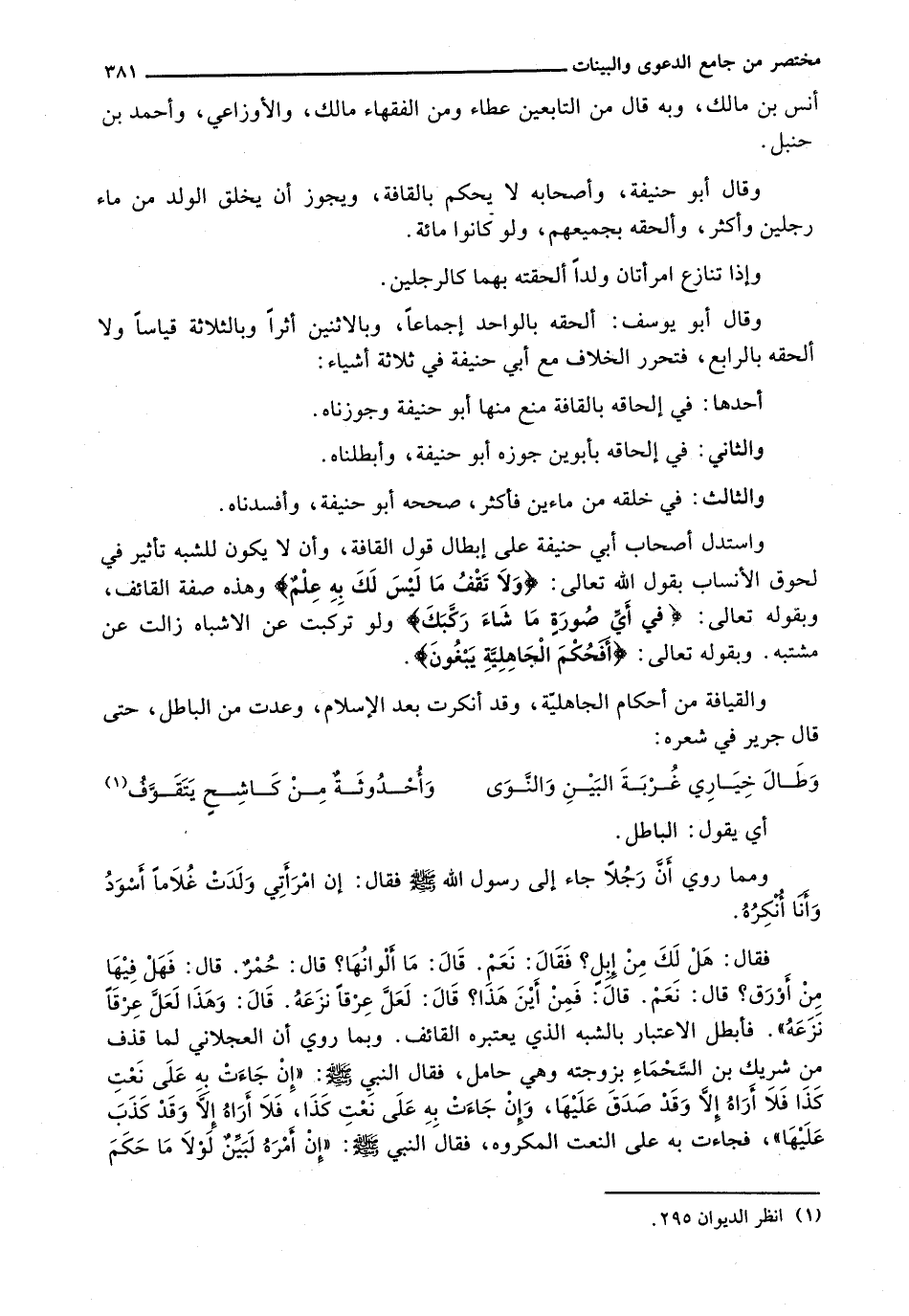فَقَالَ: هَلْ لَكَ مِنْ إِبِلٍ؟ فَقَالَ: نَعَمْ. قَالَ: مَا أَلْوَانُهَا؟ قَالَ: حُمْرٌ. قَالَ: فَهَلْ فِيهَا مِنْ أَوْرَقَ؟ قَالَ: نَعَمْ. قَالَ: فَمِنْ أَيْنَ هَذَا؟ قَالَ: لَعَلَّ عِرْقًا نَزَعَهُ. قَالَ: وَهَذَا لَعَلَّ عِرْقًا نَزَعَهُ ". فَأَبْطَلَ الِاعْتِبَارَ بِالشَّبَهِ الَّذِي يَعْتَبِرُهُ الْقَائِفُ. وَبِمَا رُوِيَ أَنَّ الْعَجْلَانِي لَمَّا قُذِفَ مِنْ شَرِيكِ بْنِ السَّحْمَاءِ بِزَوْجَتِهِ وَهِيَ حَامِلٌ، فَقَالَ النَّبِيُّ - صَلَّى اللَّهُ عَلَيْهِ وَسَلَّم َ -: " إِنْ جَاءَتْ بِهِ عَلَى نَعْتِ كَذَا فَلَا أَرَاهُ إِلَّا وَقَدْ صَدَقَ عَلَيْهَا، وَإِنْ جَاءَتْ بِهِ عَلَى نَعْتِ كَذَا، فَلَا أَرَاهُ إِلَّا وَقَدْ كَذَبَ عَلَيْهَا "، فَجَاءَتْ بِهِ عَلَى النَّعْتِ الْمَكْرُوهِ، فَقَالَ النَّبِيُّ - صَلَّى اللَّهُ عَلَيْهِ وَسَلَّم َ -: " إِنَّ أَمْرَهُ لَبَيِّنٌ لَوْلَا مَا حَكَمَ