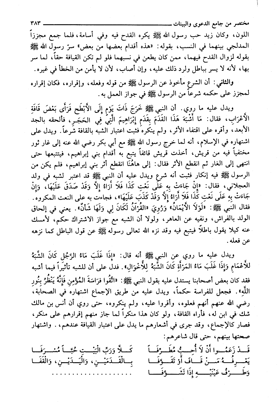 وَيَدُلُّ عَلَيْهِ مَا رُوِيَ عَنِ النَّبِيِّ - صَلَّى اللَّهُ عَلَيْهِ وَسَلَّم َ - أَنَّهُ قَالَ: " إِذَا غَلَبَ مَاءُ الرَّجُلِ كَانَ الشَّبَهُ لِلْأَعْمَامِ وَإِذَا غَلَبَ مَاءُ الْمَرْأَةِ كَانَ الشَّبَهُ لِلْأَخْوَالِ ". فَدَلَّ عَلَى أَنَّ لِلشَّبَهِ تَأْثِيرًا فِيمَا أَشْبَهَ فَقَدْ كَانَ بَعْضُ أَصْحَابِنَا يَسْتَدِلُّ عَلَيْهِ بِقَوْلِ النَّبِيِّ - صَلَّى اللَّهُ عَلَيْهِ وَسَلَّم َ -: " اتَّقُوا فِرَاسَةَ الْمُؤْمِنِ فَإِنَهُ يَنْظُرُ بِنُورِ اللَّهِ ". فَجَعَلَ لِلْفِرَاسَةِ حُكْمًا، وَيَدُلُّ عَلَيْهِ مِنْ طَرِيقِ الْإِجْمَاعِ اشْتِهَارُهُ فِي الصَّحَابَةِ، رَضِيَ اللَّهُ عَنْهُمْ أَنَّهُمْ فَعَلُوهُ، وَأُقِرُّوا عَلَيْهِ، وَلَمْ يُنْكِرُوهُ، حَتَّى رُوِيَ أَنَّ أَنَسَ بْنَ مَالِكٍ شَكَّ فِي ابْنٍ لَهُ، فَأَرَاهُ الْقَافَةَ، وَلَوْ كَانَ هَذَا مُنْكَرًا لَمَا جَازَ مِنْهُمْ إِقْرَارُهُمْ عَلَى مُنْكَرٍ، فَصَارَ كَالْإِجْمَاعِ، وَقَدْ جَرَى فِي أَشْعَارِهِمْ مَا يَدُلُّ عَلَى اعْتِبَارِ الْقِيَافَةِ عِنْدَهُمْ،. وَاشْتِهَارِ صِحَّتِهَا بَيْنَهُمْ، حَتَّى قَالَ شَاعِرُهُمْ: