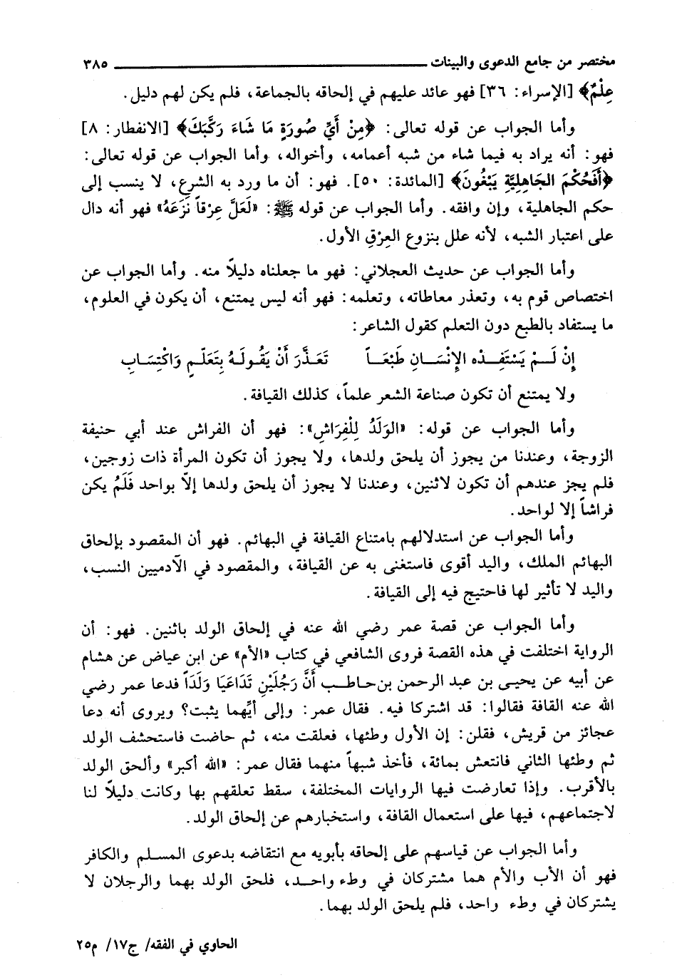 وَأَمَّا الْجَوَابُ عن قوله تعالى: {من أَيِّ صُورَةٍ مَا شَاءَ رَكَّبَكَ} [الانفطار: 8] فَهُوَ: أَنَّهُ يُرَادُ بِهِ فِيمَا شَاءَ مِنْ شَبَهِ أَعْمَامِهِ، وَأَخْوَالِهِ، وَأَمَّا الْجَوَابُ عَنْ قَوْله تَعَالَى: {أَفَحُكْمَ الْجَاهِلِيَّةِ يَبْغُونَ} [المائدة: 50] . فَهُوَ: أَنَّ مَا وَرَدَ بِهِ الشَّرْعُ، لَا يُنْسَبُ إِلَى حُكْمِ الْجَاهِلِيَّةِ، وَإِنْ وَافَقَهُ. وَأَمَّا الْجَوَابُ عَنْ قَوْلِهِ - صَلَّى اللَّهُ عَلَيْهِ وَسَلَّم َ -: " لَعَلَّ عِرْقًا نَزَعَهُ " فَهُوَ أَنَّهُ دَالٌّ عَلَى اعْتِبَارِ الشَّبَهِ، لِأَنَّهُ عَلَّلَ بِنُزُوعِ الْعِرْقِ الْأَوَّلِ.