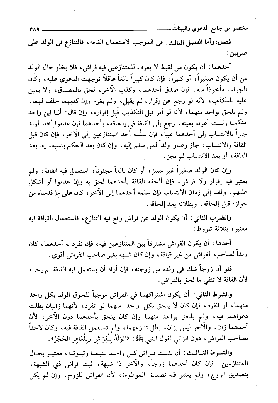 أَحَدُهَا: أَنْ يَكُونَ الْفِرَاشُ مُشْتَرِكًا بَيْنَ الْمُتَنَازِعَيْنِ فِيهِ، فَإِنْ تَفَرَّدَ بِهِ أَحَدُهُمَا، كَانَ وَلَدًا لِصَاحِبِ الْفِرَاشِ مِنْ غَيْرِ قِيَافَةٍ، وَإِنْ كَانَ شَبَهُهُ بِغَيْرِ صَاحِبِ الْفِرَاشِ أَقْوَى.