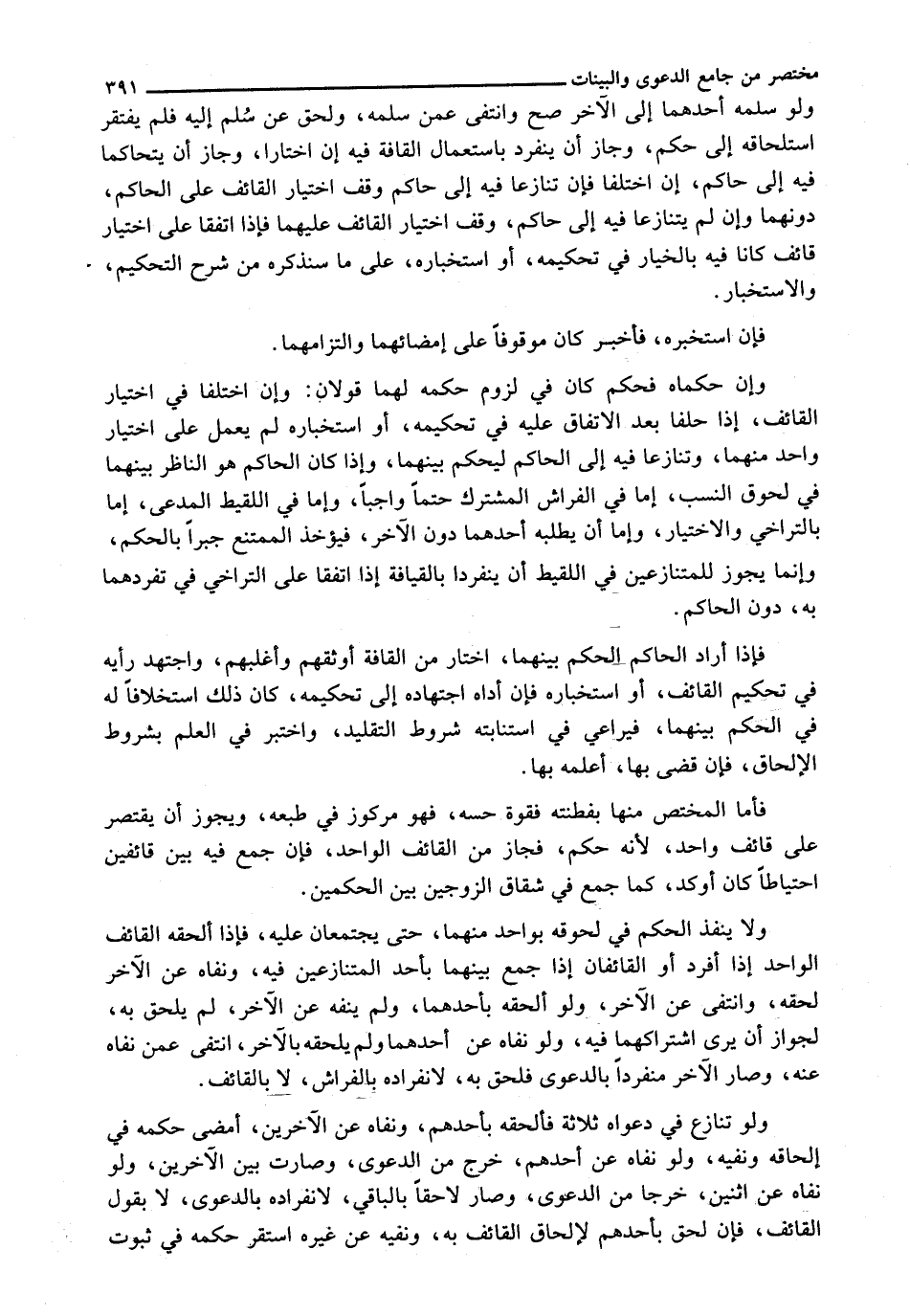 وَإِنْ حَكَّمَاهُ فَحَكَمَ كَانَ فِي لُزُومِ حُكْمِهِ لَهُمَا قولان: وإن اختلفا في اختيار القائف، إذا حلفا بعد الاتفاق عليه في تحكيمه، أو استخباره لَمْ يَعْمَلْ عَلَى اخْتِيَارِ وَاحِدٍ مِنْهُمَا، وَتَنَازَعَا فِيهِ إِلَى الْحَاكِمِ لِيَحْكُمَ بَيْنَهُمَا، وَإِذَا كَانَ الْحَاكِمُ هُوَ النَّاظِرُ بَيْنَهُمَا فِي لُحُوقِ النَّسَبِ، إما في الفراش المشترك حتما واجبا، وإما في اللقيط المدعى، إما بالتراخي والاختيار، وإما أن يطلبه أَحَدُهُمَا دُونَ الْآخَرِ، فَيُؤْخَذُ الْمُمْتَنِعُ جَبْرًا بِالْحُكْمِ، وَإِنَّمَا يَجُوزُ لِلْمُتَنَازِعَيْنِ فِي اللَّقِيطِ أَنْ يَنْفَرِدَا بالقيافة إذا اتفقا على التراخي فِي تَفَرُّدِهِمَا بِهِ، دُونَ الْحَاكِمِ.