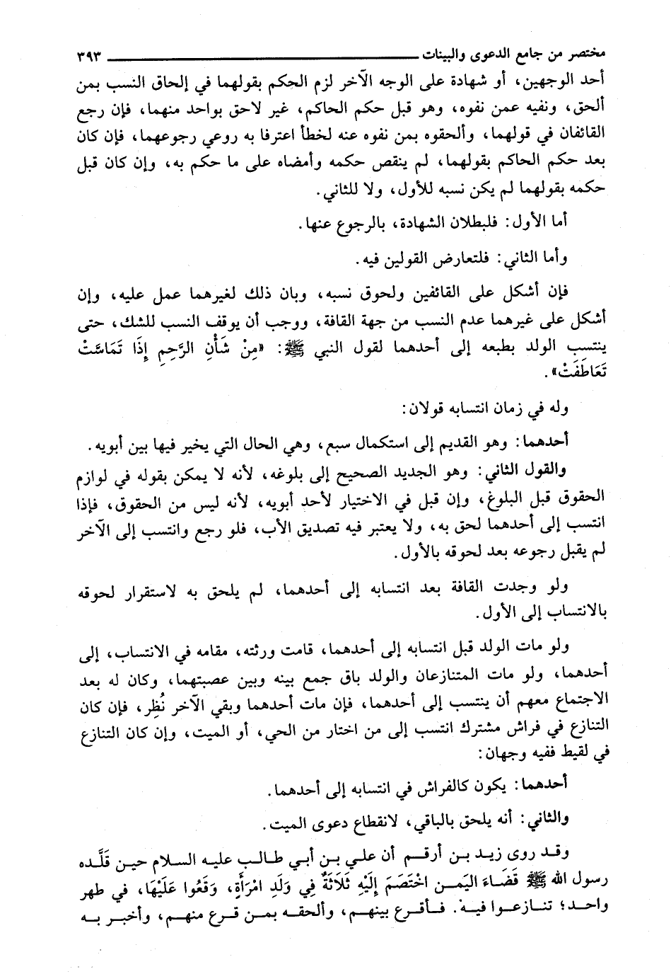 وَقَدْ رَوَى زَيْدُ بْنُ أَرْقَمَ أَنَّ عَلِيَّ بْنَ أَبِي طَالِبٍ عَلَيْهِ السَّلَامُ حِينَ قَلَّدَهُ رَسُولُ اللَّهِ - صَلَّى اللَّهُ عَلَيْهِ وَسَلَّم َ - قَضَاءَ الْيَمَنِ اخْتَصَمَ إِلَيْهِ ثَلَاثَةٌ فِي وَلَدِ امْرَأَةٍ، وَقَعُوا عَلَيْهَا، فِي طُهْرٍ وَاحِدٍ؛ تَنَازَعُوا فِيهِ. فَأَقْرَعَ بَيْنَهُمْ، وَأَلْحَقَهُ بِمَنْ قَرَعَ مِنْهُمْ، وأخبر به