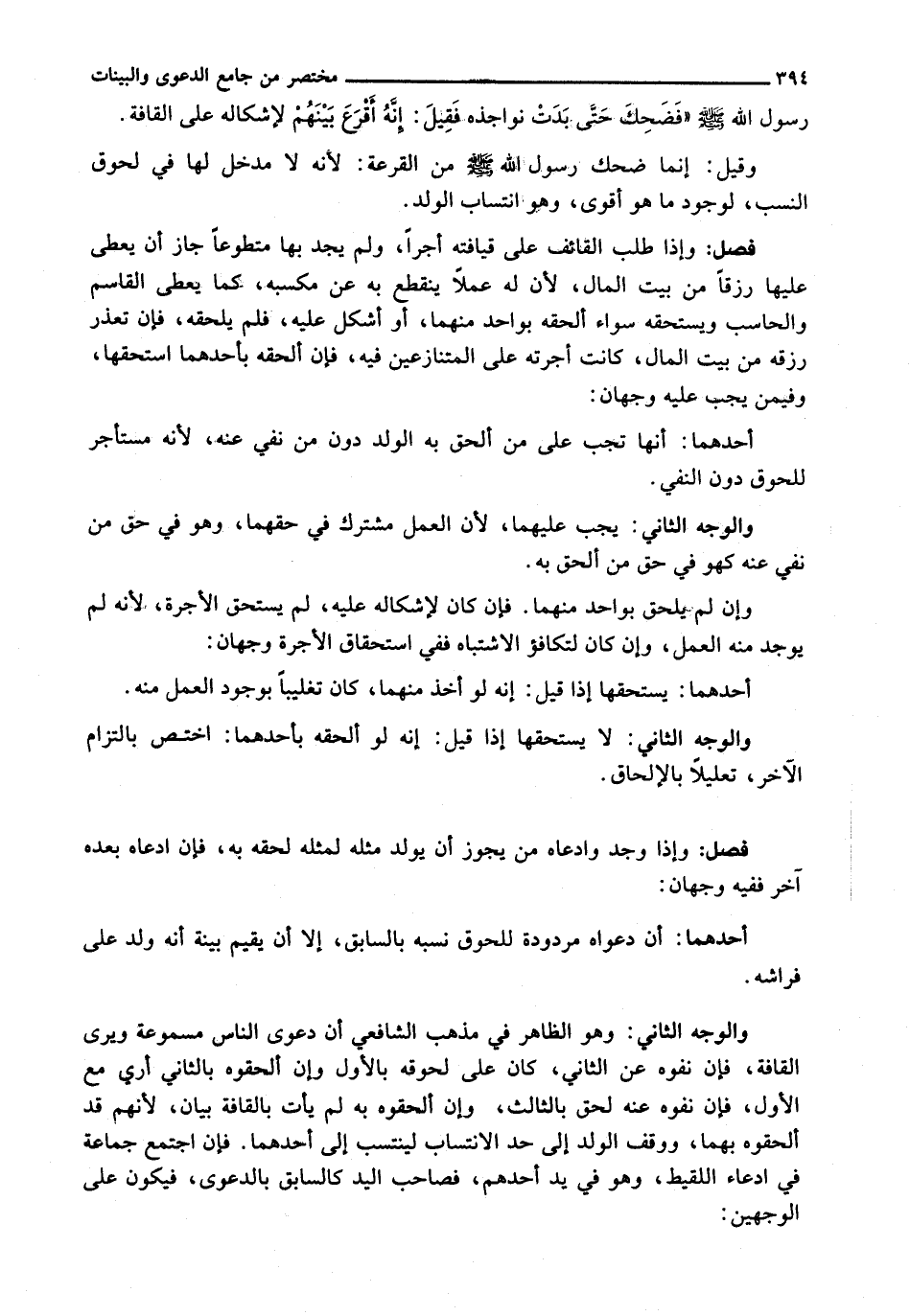 وَقِيلَ: إِنَّمَا ضَحِكَ رسول الله - صَلَّى اللَّهُ عَلَيْهِ وَسَلَّم َ - مِنَ الْقُرْعَةِ: لِأَنَّهُ لَا مَدْخَلَ لَهَا فِي لُحُوقِ النَّسَبِ: لِوُجُودِ مَا هُوَ أَقْوَى، وَهُوَ انْتِسَابُ الْوَلَدِ.