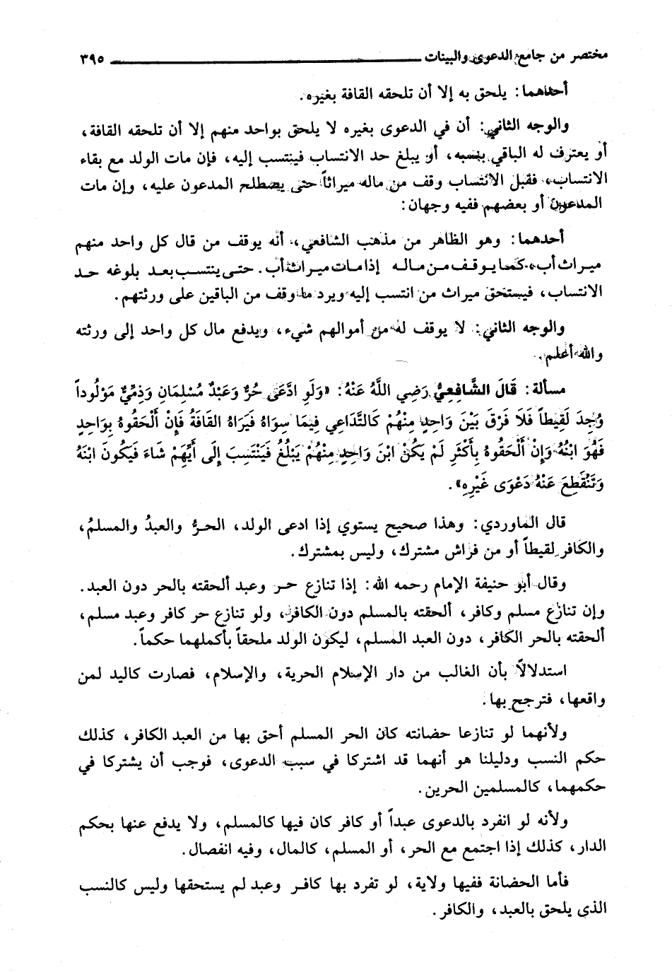 : قال الشافعي رضي الله عنه: " وَلَوِ ادَّعَى حُرٌّ وَعَبْدٌ مُسْلِمَانِ وَذِمِّيٌّ مَوْلُودًا وُجِدَ لَقِيطًا فَلَا فَرْقَ بَيْنَ وَاحِدٍ مِنْهُمْ كَالتَّدَاعِي فِيمَا سِوَاهُ فَيَرَاهُ الْقَافَةُ فَإِنْ أَلْحَقُوهُ بِوَاحِدٍ فَهُوَ ابْنُهُ وَإِنْ أَلْحَقُوهُ بِأَكْثَرَ لَمْ يَكُنِ ابْنَ وَاحِدٍ مِنْهُمْ يَبْلُغُ فَيَنْتَسِبُ إِلَى أَيِّهِمْ شَاءَ فَيَكُونُ ابْنُهُ وَتَنْقَطِعَ عَنْهُ دَعْوَى غَيْرِهِ ".