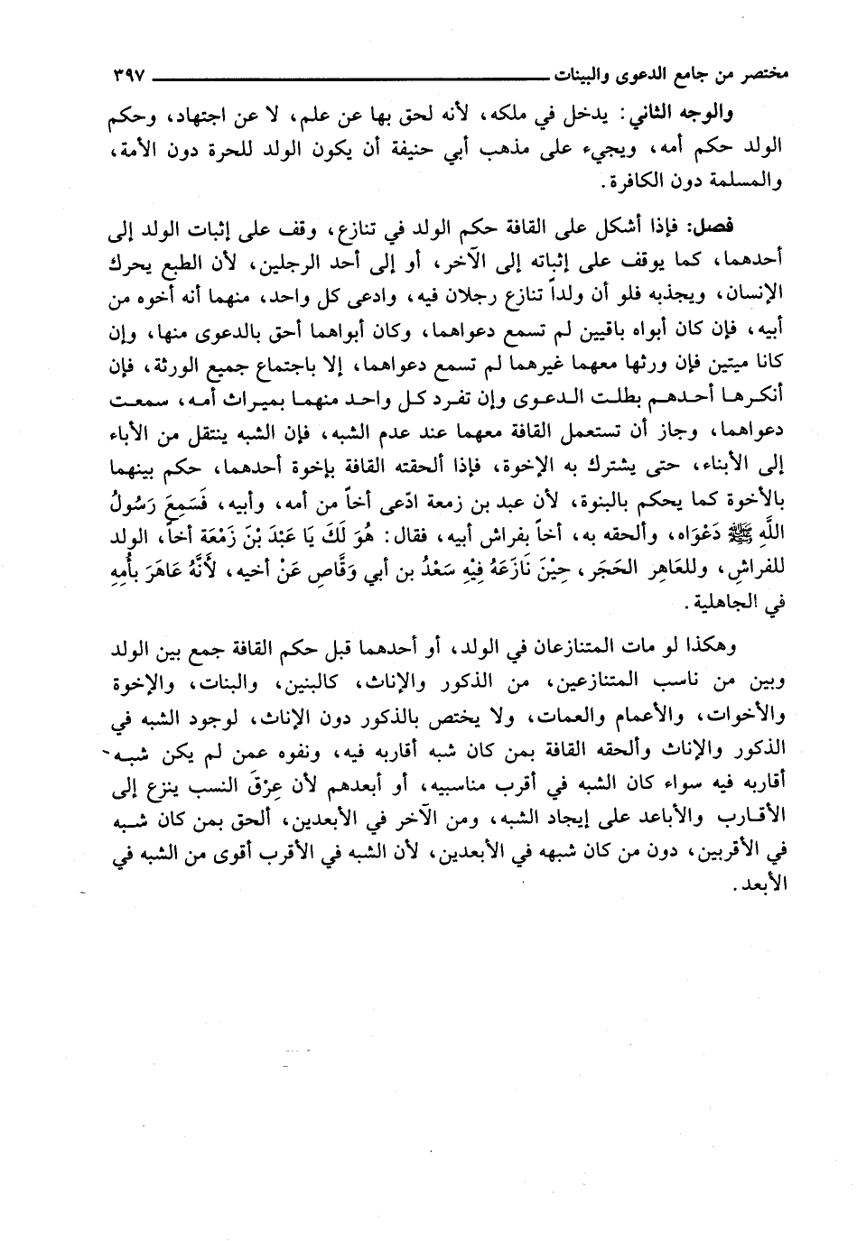 : فَإِذَا أَشْكَلَ عَلَى الْقَافَةِ حُكْمُ الْوَلَدِ فِي تَنَازُعِ، وُقِفَ عَلَى إِثْبَاتِ الْوَلَدِ إِلَى أَحَدِهِمَا، كَمَا يُوقَفُ عَلَى إِثْبَاتِهِ إِلَى الْآخَرِ، أَوْ إِلَى أَحَدِ الرَّجُلَيْنِ، لِأَنَّ الطَّبْعَ يُحَرِّكُ الْإِنْسَانَ، وَيَجْذِبُهُ فَلَوْ أَنَّ وَلَدًا تَنَازَعَ رَجُلَانِ فِيهِ، وَادَّعَى كُلُّ وَاحِدٍ، مِنْهُمَا أِنَّهُ أَخُوهُ مِنْ أَبِيهِ، فَإِنْ كَانَ أَبَوَاهُ بَاقِيَيْنِ لَمْ تُسْمِعْ دَعْوَاهُمَا، وَكَانَ أَبَوَاهُمَا أَحَقُّ بِالدَّعْوَى مِنْهَا، وَإِنْ كَانَا مَيِّتَيْنِ فَإِنْ وَرِثَهَا مَعَهُمَا غَيْرُهُمَا لَمْ تُسْمِعْ دَعْوَاهُمَا، إِلَّا بِاجْتِمَاعِ جَمِيعِ الْوَرَثَةِ، فَإِنْ أَنْكَرَهَا أَحَدُهُمْ بَطَلَتِ الدَّعْوَى وَإِنْ تَفَرَّدَ كُلُّ وَاحِدٍ مِنْهُمَا بِمِيرَاثِ أُمِّهِ، سُمِعَتْ دَعْوَاهُمَا، وَجَازَ أَنْ تُسْتَعْمَلَ الْقَافَةُ مَعَهُمَا عِنْدَ عَدَمِ الشَّبَهِ، فَإِنَّ الشَّبَهَ يَنْتَقِلُ مِنَ الآباءِ إِلَى الْأَبْنَاءِ، حَتَّى يَشْتَرِكَ بِهِ الْإخْوَةُ، فَإِذَا أَلْحَقَتْهُ الْقَافَةُ بِإِخْوَةِ أَحَدِهِمَا، حُكِمَ بينهما بالأخوة كما يحكم بالنبوة، لِأَنَّ عَبْدَ بْنَ زَمْعَةَ ادَّعَى أَخًا مِنْ أُمِّهِ، وَأَبِيهِ، فَسَمِعَ رَسُولُ اللَّهِ - صَلَّى اللَّهُ عَلَيْهِ وَسَلَّم َ - دَعْوَاهُ، وَأَلْحَقَهُ بِهِ، أَخًا بِفِرَاشِ أَبِيهِ، فَقَالَ: هُوَ لَكَ يَا عَبْدُ بْنَ زَمْعَةَ أَخًا، الْوَلَدُ لِلْفِرَاشِ، وَلِلْعَاهِرِ الْحَجَرُ، حِينَ نَازَعَهُ فِيهِ سَعْدُ بْنُ أَبِي وَقَاصٍ عَنْ أَخِيهِ، لِأَنَهُ عاهر بأمه في الجاهلية.