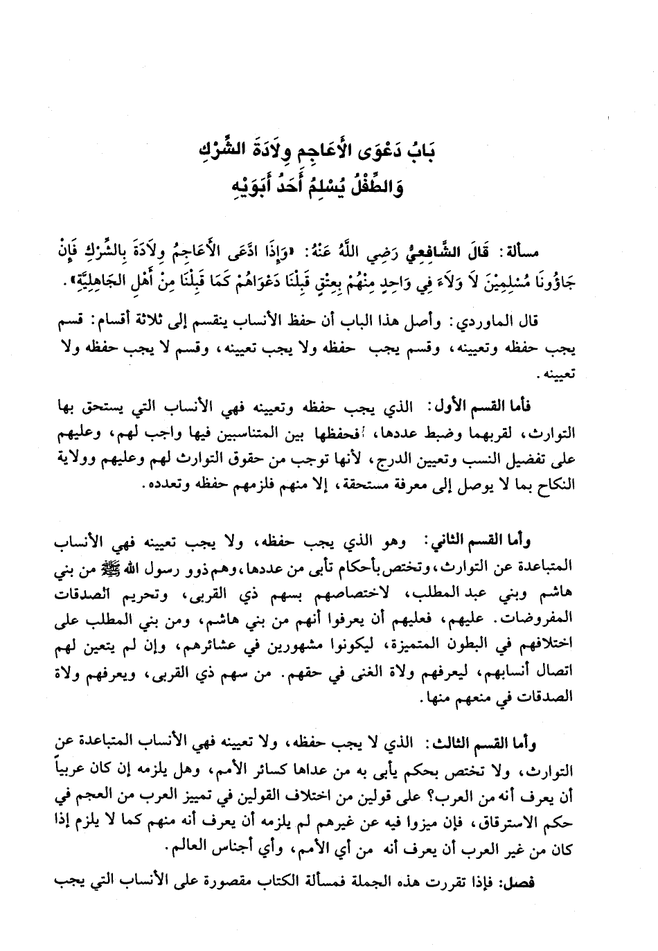 قَالَ الْمَاوَرْدِيُّ: وَأَصِلُ هَذَا الْبَابِ أَنَّ حِفْظَ الْأَنْسَابِ يَنْقَسِمُ إِلَى ثَلَاثَةِ أَقْسَامٍ: قِسْمٌ يَجِبُ حِفْظُهُ وَتَعْيِينُهُ، وَقِسْمٌ يَجِبْ حِفْظُهُ وَلَا يُجِبْ تَعْيِينُهُ، وَقِسْمٌ لَا يَجِبُ حِفْظُهُ وَلَا تَعْيِينُهُ.