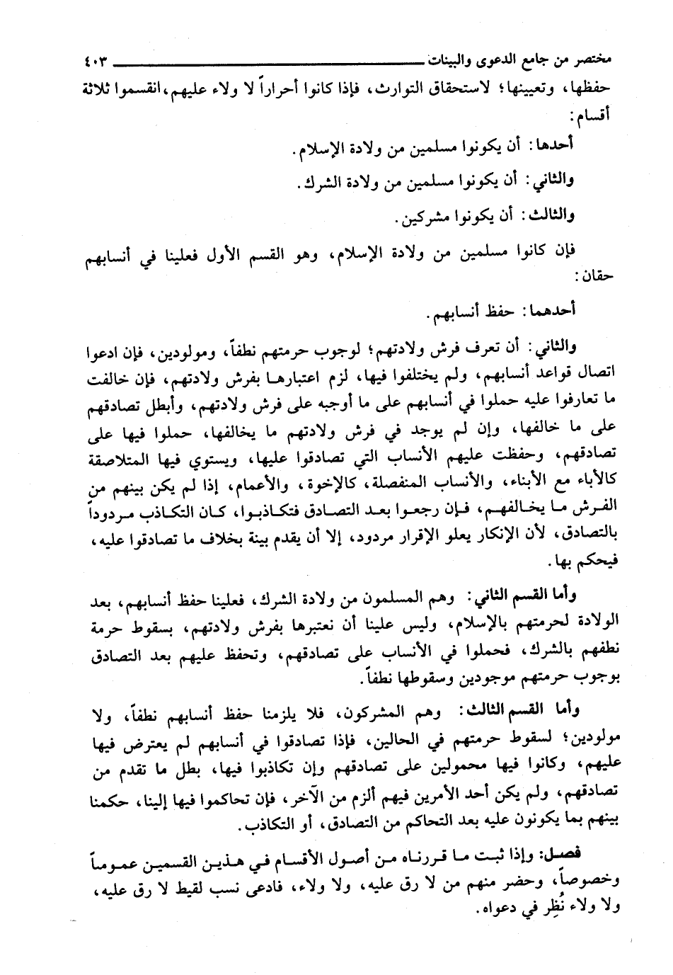 وَأَمَّا الْقِسْمُ الثَّانِي: وَهُمُ الْمُسْلِمُونَ مِنْ وِلَادَةِ الشِّرْكِ، فَعَلَيْنَا حِفْظُ أَنْسَابِهِمْ، بَعْدَ الْوِلَادَةِ لِحُرْمَتِهِمْ بِالْإِسْلَامِ، وَلَيْسَ عَلَيْنَا أَنْ نَعْتَبِرَهَا بِفُرِشِ وِلَادَتِهِمْ، بِسُقُوطِ حُرْمَةِ نُطَفِهِمْ بِالشِّرْكِ، فَحُمِلُوا فِي الْأَنْسَابِ عَلَى تَصَادُقِهِمْ، وَتُحْفَظُ عَلَيْهِمْ بَعْدَ التَّصَادُقِ بِوُجُوبِ حُرْمَتِهِمْ مَوْجُودِينَ وَسُقُوطِهَا نُطَفًا.