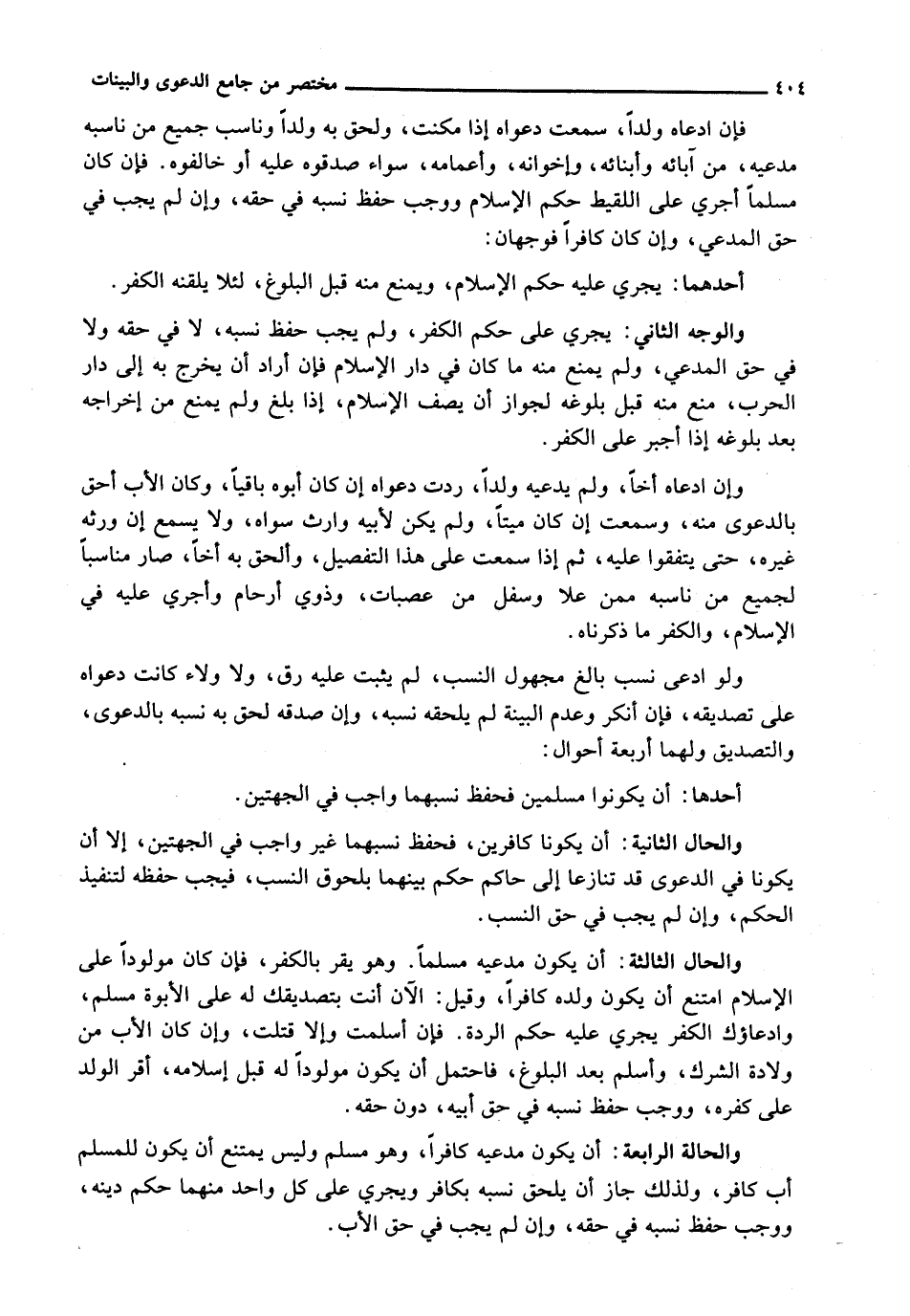 وَالْحَالَةُ الرَّابِعَةُ: أَنْ يَكُونَ مُدَّعِيهِ كَافِرًا، وَهُوَ مُسْلِمٌ وَلَيْسَ يَمْتَنِعُ أَنْ يَكُونَ لِلْمُسْلِمِ أَبٌ كَافِرٌ، وَلِذَلِكَ جَازَ أَنْ يَلْحَقَ نَسَبُهُ بِكَافِرٍ وَيَجْرِيَ عَلَى كُلِّ وَاحِدٍ مِنْهُمَا حُكْمُ دِينِهِ، وَوَجَبَ حِفْظُ نَسَبِهِ فِي حَقِّهِ، وَإِنْ لَمْ يجب في حق الأب.