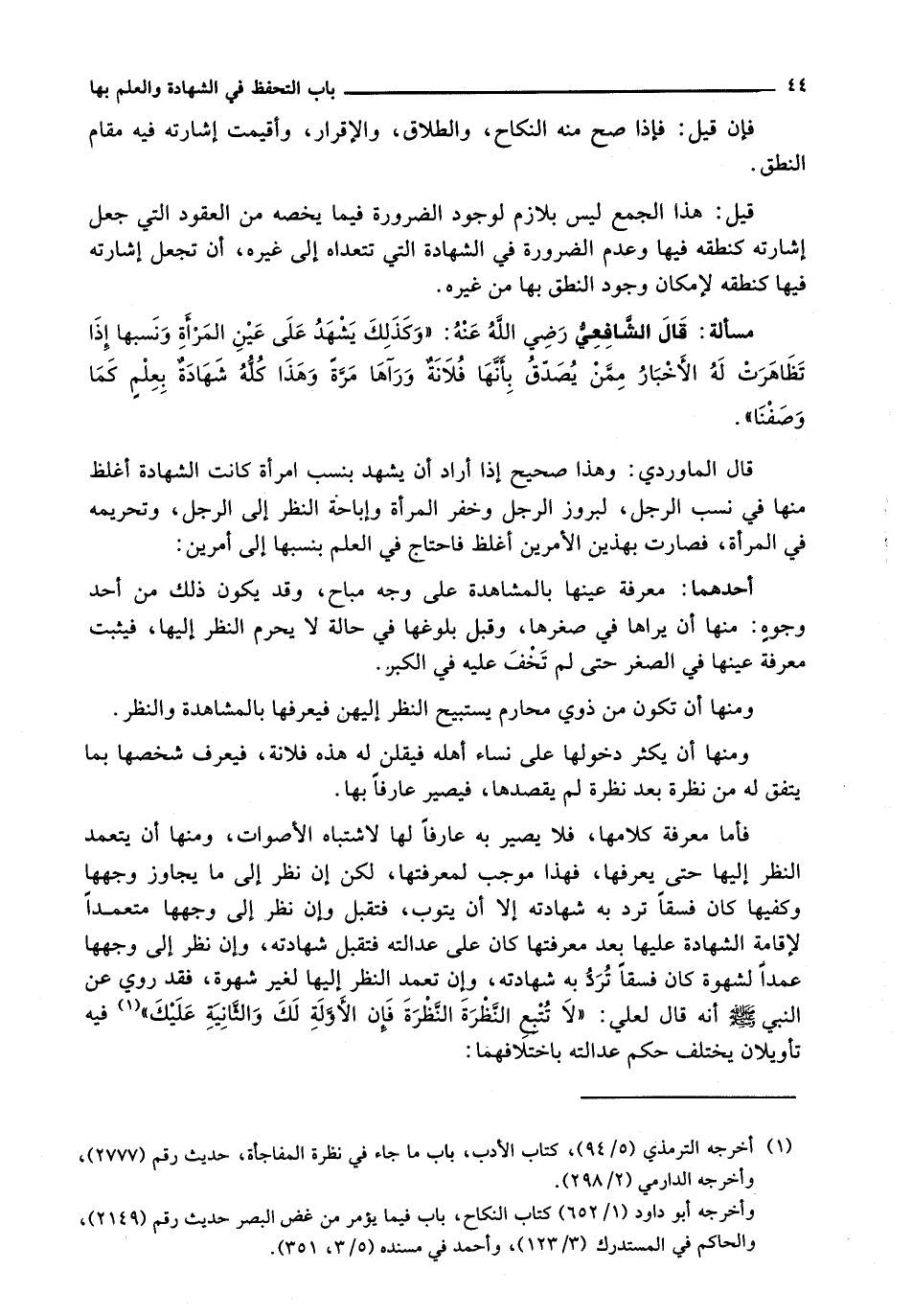 فَأَمَّا مِعْرِفَةُ كَلَامِهَا، فَلَا يَصِيرُ بِهِ عَارِفًا لَهَا لِاشْتِبَاهِ الْأَصْوَاتِ، وَمِنْهَا أَنْ يَتَعَمَّدَ النَّظَرَ إِلَيْهَا حَتَّى يَعْرِفَهَا، فَهَذَا مُوجِبٌ لِمَعْرِفَتِهَا، لَكِنْ إِنْ نَظَرَ إِلَى مَا يُجَاوِزُ وَجْهَهَا وَكَفَّيْهَا كَانَ فِسْقًا تُرَدُّ بِهِ شَهَادَتُهُ إِلَّا أَنْ يَتُوبَ، فَتُقْبَلُ وَإِنْ نَظَرَ إِلَى وَجْهِهَا مُتَعَمِّدًا لِإِقَامَةِ الشَّهَادَةِ عَلَيْهَا بَعْدَ مَعْرِفَتِهَا كَانَ عَلَى عَدَالَتِهِ فَتُقْبَلُ شَهَادَتُهُ، وَإِنْ نَظَرَ إِلَى وَجْهِهَا عَمْدًا لِشَهْوَةٍ كَانَ فِسْقًا تُرَدُّ بِهِ شَهَادَتُهُ، وَإِنْ تَعَمَّدَ النَّظَرَ إِلَيْهَا لِغَيْرِ شَهْوَةٍ، فَقَدْ رُوِيَ عَنِ النَّبِيِّ - صَلَّى اللَّهُ عَلَيْهِ وَسَلَّم َ - أَنَّهُ قَالَ لَعَلِيٍّ: " لَا تُتْبِعِ النَّظْرَةَ النَّظْرَةَ فإن الأولة لَكَ وَالثَّانِيَةَ عَلَيْكَ " فِيهِ تَأْوِيلَانِ يَخْتَلِفُ حُكْمُ عدالته باختلافهما: