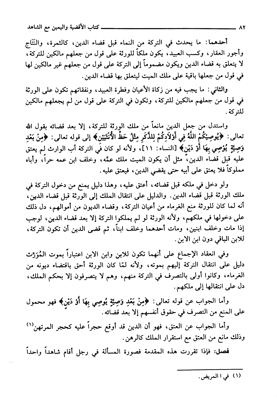 وَاسْتَدَلَّ مَنْ جَعَلَ الدَّيْنَ مَانِعًا مِنْ مِلْكِ الْوَرَثَةِ لِلتَّرِكَةِ، إِلَّا بَعْدَ قَضَائِهِ بِقَوْلِ اللَّهُ تَعَالَى: {يُوصِيكُمُ اللَّهُ فِي أَوْلادِكُمْ لِلذَّكَرِ مِثْلُ حَظِّ الأُنْثَيَيْنِ} إِلَى قَوْله تَعَالَى: {مِنْ بَعْدِ وَصِيَّةٍ يُوصَى بِهَا أَوْ دَيْنٍ} [النساء: 11] ، وَلِأَنَّهُ لَوْ كَانَ فِي التَّرِكَةِ أَبُ الْوَارِثِ لَمْ يُعْتَقْ عَلَيْهِ قَبْلَ قَضَاءِ الدَّيْنِ، مِثْلَ أَنْ يَكُونَ الْمَيِّتُ مَلَكَ عَمَّهُ، وَخَلَّفَ ابْنَ عَمِّهِ حُرًّا، وَأَبَاهُ مَمْلُوكًا فَلَا يُعْتَقُ عَلَى أَبِيهِ حَتَّى يَقْضِيَ الدَّيْنَ، فَيُعْتَقُ عَلَيْهِ.