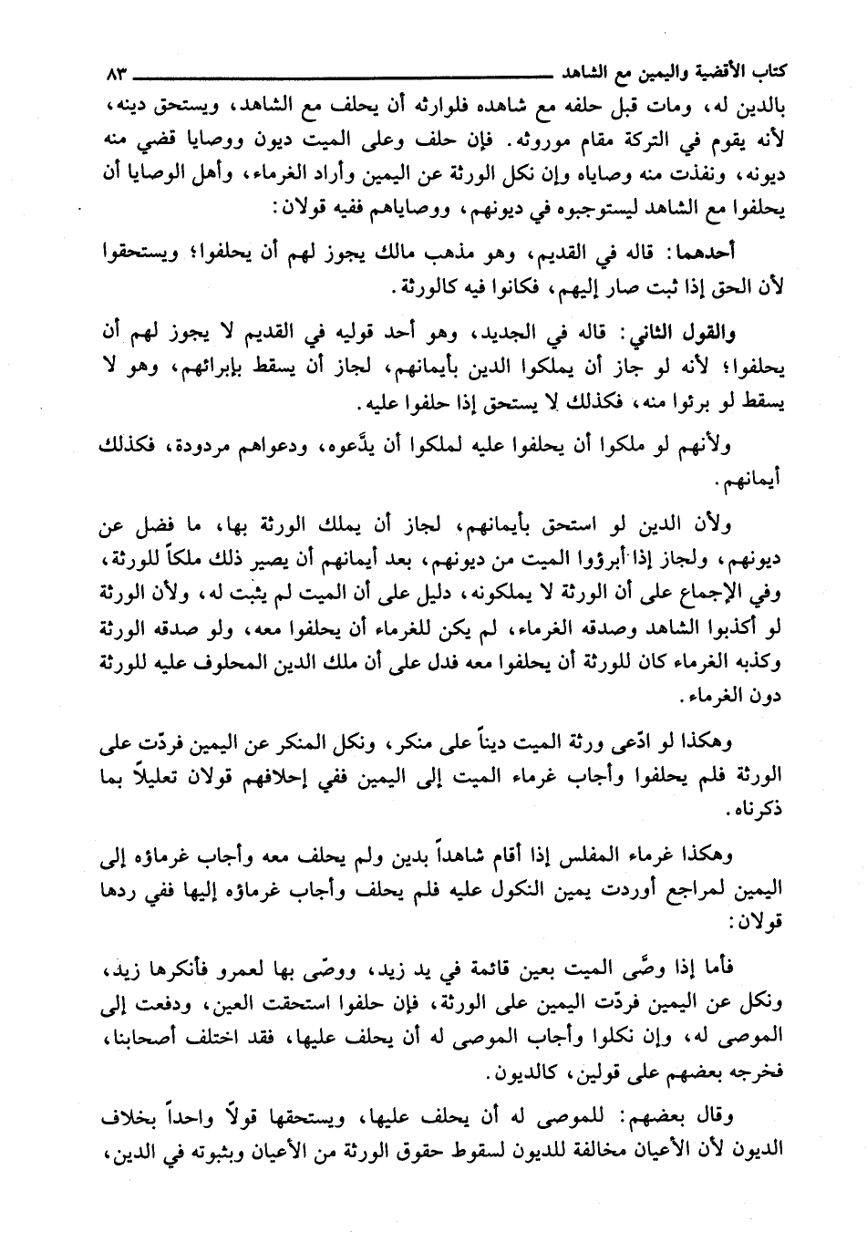 وَلِأَنَّ الدَّيْنَ لَوِ اسْتُحِقَّ بِأَيْمَانِهِمْ، لَجَازَ أَنْ يُمَلَّكَ الْوَرَثَةُ بِهَا، ما فضل عن ديونهم، ولجاز إذا أبرؤوا الْمَيِّتَ مِنْ دُيُونِهِمْ، بَعْدَ أَيْمَانِهِمْ أَنْ يَصِيرَ ذَلِكَ مِلْكًا لِلْوَرَثَةِ، وَفِي الْإِجْمَاعِ عَلَى أَنَّ الْوَرَثَةَ لَا يَمْلِكُونَهُ، دَلِيلٌ عَلَى أَنَّ الْمَيِّتَ لَمْ يَثْبُتْ لَهُ، وَلِأَنَّ الْوَرَثَةَ لَوْ أَكْذَبُوا الشَّاهِدَ وَصَدَّقَهُ الْغُرَمَاءُ، لَمْ يَكُنْ لِلْغُرَمَاءِ أَنْ يَحْلِفُوا مَعَهُ، وَلَوْ صَدَّقَهُ الْوَرَثَةُ وَكَذَّبَهُ الْغُرَمَاءُ كَانَ لِلْوَرَثَةِ أَنْ يَحْلِفُوا مَعَهُ فَدَلَّ عَلَى أَنَّ مِلْكَ الدَّيْنِ الْمَحْلُوفِ عَلَيْهِ لِلْوَرَثَةِ دُونَ الْغُرَمَاءِ.