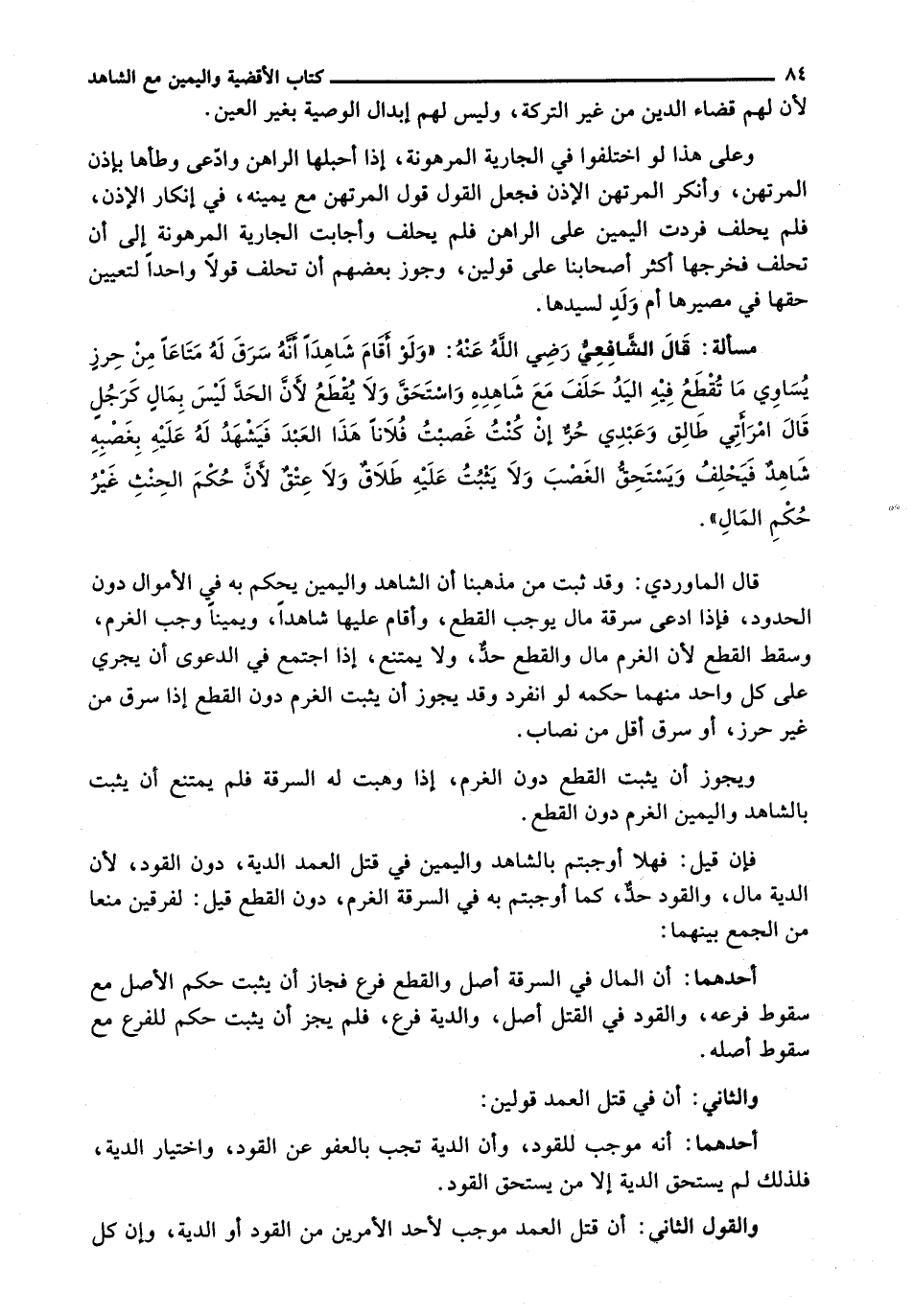 قَالَ الْمَاوَرْدِيُّ: وَقَدْ ثَبَتَ مِنْ مَذْهَبِنَا أَنَّ الشَّاهِدَ وَالْيَمِينَ يُحْكَمُ بِهِ فِي الْأَمْوَالِ دُونَ الْحُدُودِ، فَإِذَا ادَّعَى سَرِقَةَ مَالٍ يُوجِبُ الْقَطْعَ، وَأَقَامَ عَلَيْهَا شَاهِدًا، وَيَمِينًا وَجَبَ الْغُرْمُ، وَسَقَطَ الْقَطْعُ لِأَنَّ الْغُرْمَ مَالٌ وَالْقَطْعَ حَدٌّ، وَلَا يَمْتَنِعُ، إِذَا اجْتَمَعَ فِي الدَّعْوَى أَنْ يَجْرِيَ عَلَى كُلِّ وَاحِدٍ مِنْهُمَا حُكْمُهُ لَوِ انْفَرَدَ وَقَدْ يَجُوزُ أَنْ يَثْبُتَ الْغُرْمُ دُونَ الْقَطْعِ إِذَا سَرَقَ مِنْ غَيْرِ حِرْزٍ، أَوْ سَرَقَ أَقَلَّ مِنْ نِصَابٍ.