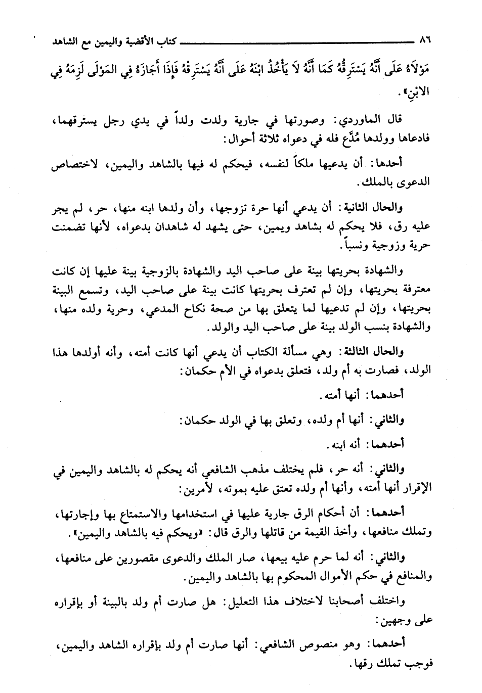 أَحَدُهُمَا: إِنَّ أَحْكَامَ الرِّقِّ جَارِيَةٌ عَلَيْهَا فِي اسْتِخْدَامِهَا وَالِاسْتِمْتَاعِ بِهَا وَإِجَارَتِهَا، وَتَمَلُّكِ مَنَافِعِهَا، وَأَخْذِ الْقِيمَةِ مِنْ قَاتِلِهَا وَالرِّقِّ قَالَ: " وَيُحْكَمُ فِيهِ بِالشَّاهِدِ وَالْيَمِينِ ".