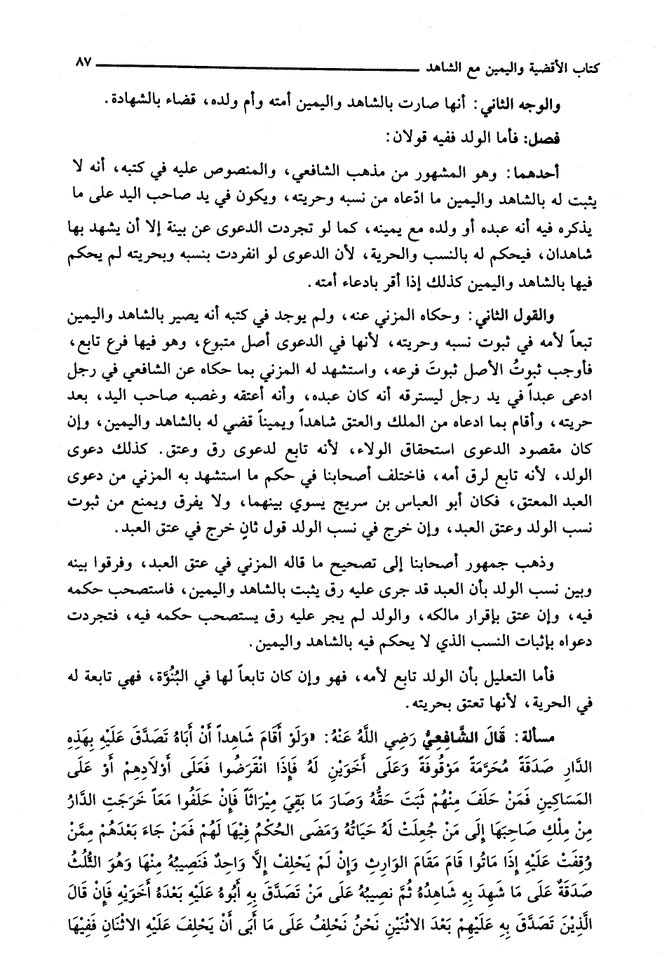 وَالْقَوْلُ الثَّانِي: وَحَكَّاهُ الْمُزَنِيُّ عَنْهُ، وَلَمْ يُوجَدْ فِي كُتُبِهِ أَنَّهُ يَصِيرُ بِالشَّاهِدِ وَالْيَمِينِ تَبَعًا لِأُمِّهِ فِي ثُبُوتِ نَسَبِهِ وَحُرِّيَّتِهِ، لِأَنَّهَا فِي الدَّعْوَى أَصْلٌ مَتْبُوعٌ، وَهُوَ فِيهَا فَرْعٌ تَابِعٌ، فَأَوْجَبَ ثُبُوتُ الْأَصْلِ ثُبُوتَ فَرْعِهِ، وَاسْتَشْهَدَ لَهُ الْمُزَنِيُّ بِمَا حَكَاهُ عَنِ الشَّافِعِيِّ فِي رَجُلٍ ادَّعَى عَبْدًا فِي يَدِ رَجُلٍ لِيَسْتَرِقَّهُ أَنَّهُ كَانَ عَبْدَهُ، وَأَنَّهُ أَعْتَقَهُ وَغَصَبَهُ صَاحِبُ الْيَدِ، بَعْدَ حُرِّيَّتِهِ، وَأَقَامَ بِمَا ادَّعَاهُ مِنَ الْمِلْكِ وَالْعِتْقِ شَاهِدًا وَيَمِينًا قُضِيَ لَهُ بِالشَّاهِدِ وَالْيَمِينِ، وَإِنْ كَانَ مَقْصُودُ الدَّعْوَى اسْتِحْقَاقَ الْوَلَاءِ، لِأَنَّهُ تَابِعٌ لِدَعْوَى رِقٍّ وَعِتْقٍ. كَذَلِكَ دَعْوَى الْوَلَدِ، لِأَنَّهُ تَابِعٌ لِرِقِّ أُمِّهِ، فَاخْتَلَفَ أَصْحَابُنَا فِي حُكْمِ مَا اسْتَشْهَدَ بِهِ الْمُزَنِيُّ مِنْ دَعْوَى الْعَبْدِ الْمُعْتَقِ، فَكَانَ أَبُو الْعَبَّاسِ بْنِ سُرَيْجٍ يُسَوِّي بَيْنَهُمَا، وَلَا يُفَرِّقُ وَيَمْنَعُ مِنْ ثُبُوتِ نَسَبِ الْوَلَدِ وَعِتْقِ الْعَبْدِ، وَإِنْ خَرَّجَ فِي نَسَبِ الْوَلَدِ قَوْلٌ ثَانٍ خَرَجَ فِي عِتْقِ الْعَبْدِ.
