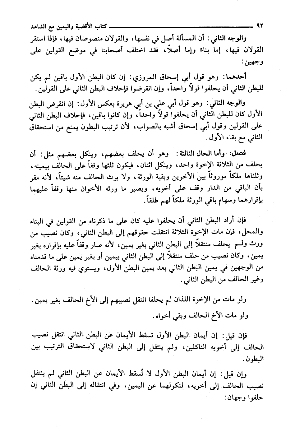 وَالْوَجْهُ الثَّانِي: وَهُوَ قَوْلُ أَبِي عَلِيِّ بْنِ أَبِي هُرَيْرَةَ بِعَكْسِ الْأَوَّلِ: إِنِ انْقَرَضَ الْبَطْنُ الْأَوَّلُ كَانَ لِلْبَطْنِ الثَّانِي أَنْ يَحْلِفُوا قَوْلًا وَاحِدًا، وَإِنْ كَانُوا بَاقِينَ، فَإِحْلَافُ الْبَطْنِ الثَّانِي عَلَى الْقَوْلَيْنِ وَقَوْلُ أَبِي إِسْحَاقَ أَشْبَهُ بِالصَّوَابِ، لِأَنَّ تَرْتِيبَ الْبُطُونِ يَمْنَعُ مِنِ اسْتِحْقَاقِ الثَّانِي مَعَ بَقَاءِ الْأَوَّلِ.