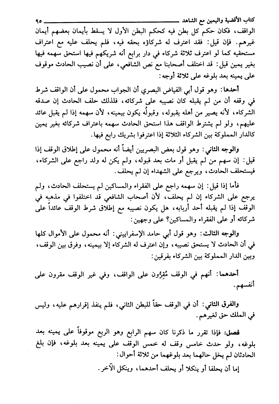 الْوَاقِفِ، فَكَانَ حُكْمُ كُلِّ بَطْنٍ فِيهِ كَحُكْمِ الْبَطْنِ الْأَوَّلِ لَا يَسْقُطُ بِأَيْمَانِ بَعْضِهِمْ أَيْمَانُ غَيْرِهِمْ. فَإِنْ قِيلَ: فَقَدِ اعْتَرَفَ لَهُ شُرَكَاؤُهُ بِحَقِّهِ فِيهِ، فَلَمْ يَحْلِفْ عَلَيْهِ مَعَ اعْتِرَافِ مُسْتَحِقِّيهِ كَمَا لَوِ اعْتَرَفَ ثَلَاثَةُ شُرَكَاءَ فِي دَارٍ بِرَابِعٍ أَنَّهُ شَرِيكُهُمْ فِيهَا اسْتَحَقَّ سَهْمَهُ فِيهَا بِغَيْرِ يَمِينٍ قِيلَ: قَدِ اخْتَلَفَ أَصْحَابُنَا مَعَ نَصِّ الشَّافِعِيِّ، عَلَى أَنَّ نَصِيبَ الْحَادِثِ مَوْقُوفٌ عَلَى يَمِينِهِ بَعْدَ بُلُوغِهِ عَلَى ثَلَاثَةِ أَوْجُهٍ: