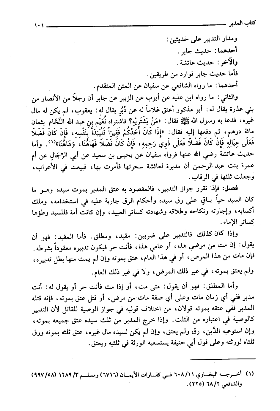 وَالثَّانِي: مَا رَوَاهُ ابْنُ عُلَيَّةَ عَنْ أَيُّوبَ عَنِ الزُّبَيْرِ عَنْ جَابِرٍ أَنَّ رَجُلًا مِنَ الْأَنْصَارِ مِنْ بَنِي عُذْرَةَ يُقَالُ لَهُ: أَبُو مَذْكُورٍ أَعْتَقَ غُلَامًا لَهُ عَنْ دُبُرٍ يُقَالُ لَهُ: يَعْقُوبُ، لَمْ يَكُنْ لَهُ مَالٌ غَيْرُهُ، فَدَعَا بِهِ رَسُولُ اللَّهِ - صَلَّى اللَّهُ عَلَيْهِ وَسَلَّم َ - فَقَالَ: (مَنْ يَشْتَرِيهِ؟ فَاشْتَرَاهُ نُعَيْمُ بْنُ عَبْدِ الله النحام بثمان مائة دِرْهَمٍ، ثُمَّ دَفَعَهَا إِلَيْهِ فَقَالَ: (إِذَا كَانَ أَحَدُكُمْ فَقِيرًا فَلْيَبْدَأْ بِنَفْسِهِ، فَإِنْ كَانَ فَضْلًا فَعَلَى عِيَالِهِ فَإِنْ كَانَ فَضْلًا فَعَلَى ذَوِي رَحِمِهِ، فَإِنْ كَانَ فَضْلًا فَهَاهُنَا، وَهَاهُنَا) . وَأَمَّا حَدِيثُ عَائِشَةَ رَضِيَ اللَّهُ عَنْهَا فَرَوَاهُ سُفْيَانُ عَنْ يَحْيَى بْنِ سَعِيدٍ عَنْ أَبِي الرِّجَالِ عَنْ أُمِّ عَمْرَةِ بِنْتِ عَبْدِ الرَّحْمَنِ أَنَّ مُدَبَّرَةً لِعَائِشَةَ سَحَرَتْهَا فَأَمَرَتْ بِهَا، فَبِيعَتْ فِي الْأَعْرَابِ، وَجَعَلَتْ ثُلُثَهَا فِي الرِّقَابِ.