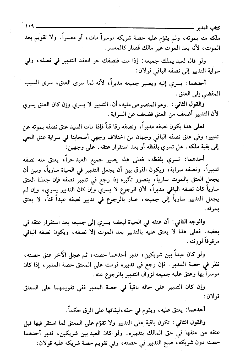 وَالْوَجْهُ الثَّانِي: أَنَّ عِتْقَهُ فِي الْحَيَاةِ لِبَعْضِهِ يَسْرِي إِلَى جَمِيعِهِ بَعْدَ اسْتِقْرَارِ عِتْقِهِ فِي بَعْضِهِ. فَعَلَى هَذَا لَا يُعْتَقُ عَلَيْهِ بِالتَّدْبِيرِ بَعْدَ الْمَوْتِ إِلَّا نِصْفُهُ، وَيَكُونُ نِصْفُهُ الْبَاقِي مَرْقُوقًا لِوَرَثَتِهِ.