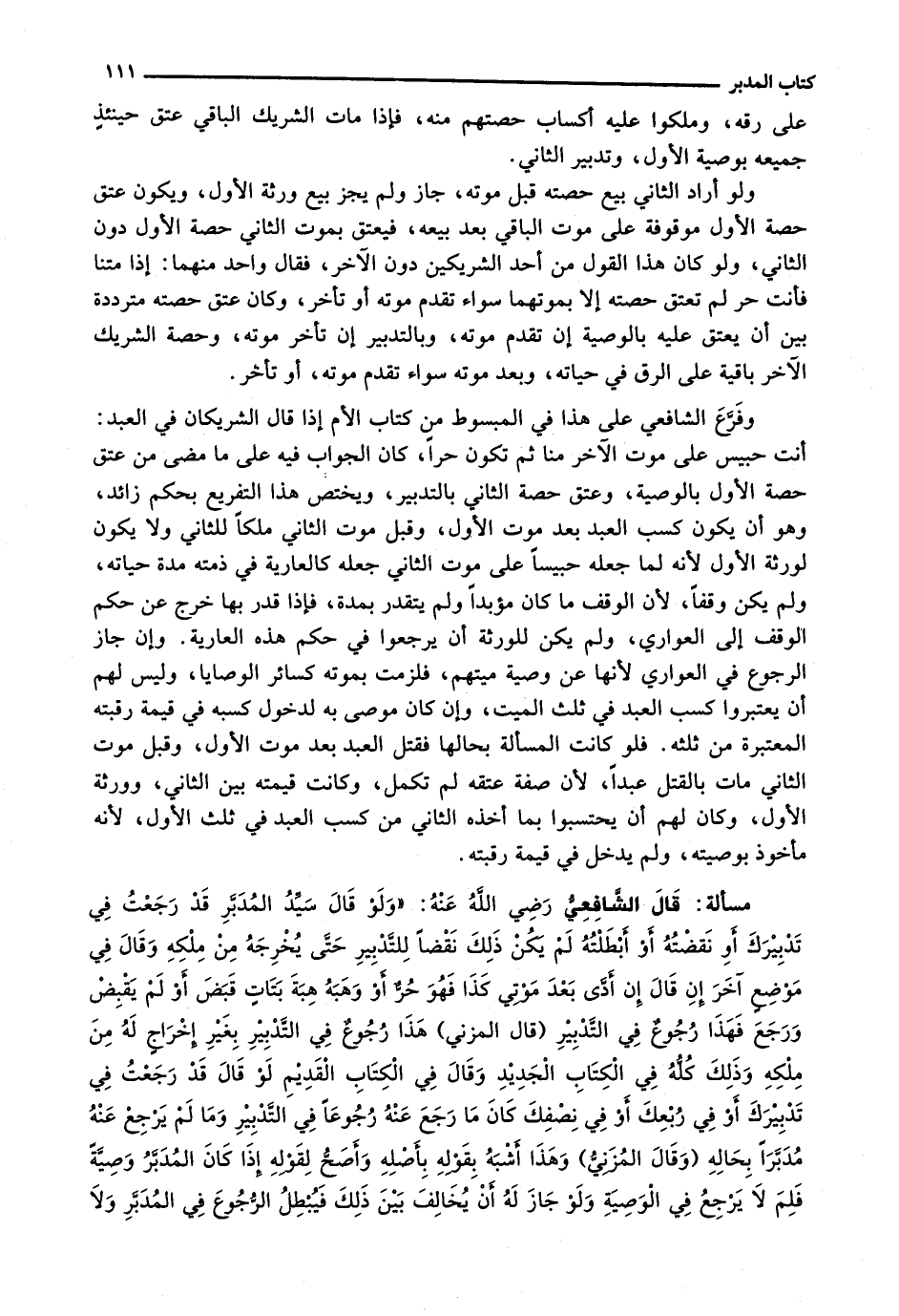 وَفَرَّعَ الشَّافِعِيُّ عَلَى هَذَا فِي الْمَبْسُوطِ مِنْ كِتَابِ الْأُمِّ إِذَا قَالَ الشَّرِيكَانِ فِي الْعَبْدِ: أَنْتَ حَبِيسٌ عَلَى مَوْتِ الْآخَرِ مِنَّا ثُمَّ تَكُونُ حُرًّا، كَانَ الْجَوَابُ فِيهِ عَلَى مَا مَضَى مِنْ عِتْقِ حِصَّةِ الْأَوَّلِ بِالْوَصِيَّةِ، وَعِتْقِ حِصَّةِ الثَّانِي بِالتَّدْبِيرِ، وَيَخْتَصُّ هَذَا التَّفْرِيعُ بِحُكْمٍ زَائِدٍ، وَهُوَ أَنْ يَكُونَ كَسْبُ الْعَبْدِ بَعْدَ مَوْتِ الْأَوَّلِ، وَقَبْلَ مَوْتِ الثَّانِي مِلْكًا لِلثَّانِي وَلَا يَكُونُ لِوَرَثَةِ الْأَوَّلِ لِأَنَّهُ لَمَّا جَعَلَهُ حَبِيسًا عَلَى مَوْتِ الثَّانِي جَعَلَهُ كَالْعَارِيَةِ فِي ذِمَّتِهِ مُدَّةَ حَيَّاتِهِ، وَلَمْ يَكُنْ وَقْفًا، لِأَنَّ الْوَقْفَ مَا كَانَ مُؤَبَّدًا وَلَمْ يَتَقَدَّرْ بِمُدَّةٍ، فَإِذَا قُدِّرَ بِهَا خَرَجَ عَنْ حُكْمِ الْوَقْفِ إِلَى الْعَوَارِي، وَلَمْ يَكُنْ لِلْوَرَثَةِ أَنْ يَرْجِعُوا فِي حُكْمِ هَذِهِ الْعَارِيَةِ. وَإِنْ جَازَ الرُّجُوعُ فِي الْعَوَارِي لِأَنَّهَا عَنْ وَصِيَّةِ مَيِّتِهِمْ، فَلَزِمَتْ بِمَوْتِهِ كَسَائِرِ الْوَصَايَا، وَلَيْسَ لَهُمْ أَنْ يَعْتَبِرُوا كَسْبَ الْعَبْدِ فِي ثُلُثِ الْمَيِّتِ، وَإِنْ كَانَ مُوصَى بِهِ لِدُخُولِ كَسْبِهِ فِي قِيمَةِ رَقَبَتَهُ الْمُعْتَبَرَةِ مِنْ ثُلُثِهِ. فَلَوْ كَانَتِ الْمَسْأَلَةُ بِحَالِهَا فَقُتِلَ الْعَبْدُ بَعْدَ مَوْتِ الْأَوَّلِ، وَقَبْلَ مَوْتِ الثَّانِي مَاتَ بِالْقَتْلِ عَبْدًا، لِأَنَّ صِفَةَ عِتْقِهِ لَمْ تَكْمُلْ، وَكَانَتْ قِيمَتُهُ بَيْنَ الثَّانِي، وَوَرَثَةِ الْأَوَّلِ، وَكَانَ لَهُمْ أَنْ يَحْتَسِبُوا بِمَا أَخَذَهُ الثَّانِي مِنْ كَسْبِ الْعَبْدِ فِي ثُلُثِ الْأَوَّلِ، لِأَنَّهُ مَأْخُوذٌ بِوَصِيَّتِهِ، وَلَمْ يَدْخُلْ فِي قِيمَةِ رقبته.