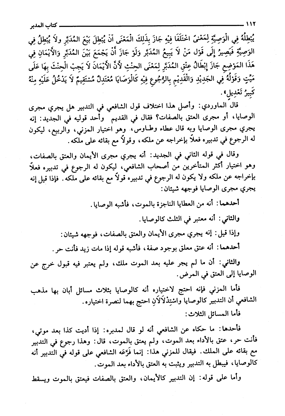 قَالَ الْمَاوَرْدِيُّ: وَأَصْلُ هَذَا اخْتِلَافُ قَوْلِ الشَّافِعِيِّ فِي التَّدْبِيرِ هَلْ يَجْرِي مَجْرَى الْوَصَايَا، أَوْ مَجْرَى الْعِتْقِ بِالصِّفَاتِ؟ فَقَالَ فِي الْقَدِيمِ وَأَحَدُ قَوْلَيْهِ فِي الْجَدِيدِ: أَنَّهُ يَجْرِي مَجْرَى الْوَصَايَا وَبِهِ قَالَ عَطَاءٌ وَطَاوُسٌ، وَهُوَ اخْتِيَارُ الْمُزَنِيِّ، وَالرَّبِيعِ، لِيَكُونَ لَهُ الرُّجُوعُ فِي تَدْبِيرِهِ فِعْلًا بِإِخْرَاجِهِ عَنْ مِلْكِهِ، وَقَوْلًا مَعَ بَقَائِهِ عَلَى مِلْكِهِ.