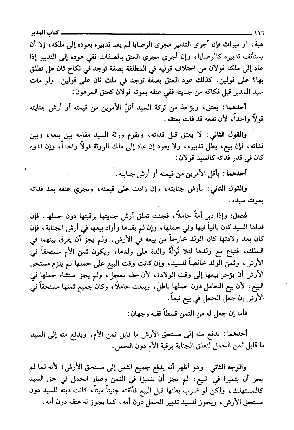 هِبَةٍ، أَوْ مِيرَاثٍ فَإِنْ أَجْرَي التَّدْبِيرَ مَجْرَى الْوَصَايَا لَمْ يَعُدْ تَدْبِيرُهُ بِعَوْدِهِ إِلَى مِلْكِهِ، إِلَّا أَنْ يُسْتَأْنَفَ تَدْبِيرُهُ كَالْوَصَايَا، وَإِنْ أُجْرِيَ مَجْرَى الْعِتْقِ بِالصِّفَاتِ فَفِي عَوْدِهِ إِلَى التَّدْبِيرِ إِذَا عَادَ إِلَى مِلْكِهِ قَوْلَانِ مِنِ اخْتِلَافِ قَوْلَيْهِ فِي الْمُطَلَّقَةِ بِصِفَةٍ تُوجَدُ فِي نِكَاحٍ ثَانٍ هَلْ تُطَلَّقُ بِهَا؟ عَلَى قَوْلَيْنِ. كَذَلِكَ عَوْدُ الْعِتْقِ بِصِفَةٍ تُوجَدُ فِي مِلْكٍ ثَانٍ عَلَى قَوْلَيْنِ. وَلَوْ مَاتَ سَيِّدُ الْمُدَبَّر قَبْلَ فِكَاكِهِ مِنْ جِنَايَتِهِ فَفِي عِتْقِهِ بِمَوْتِهِ قَوْلَانِ كَعِتْقِ الْمَرْهُونِ: