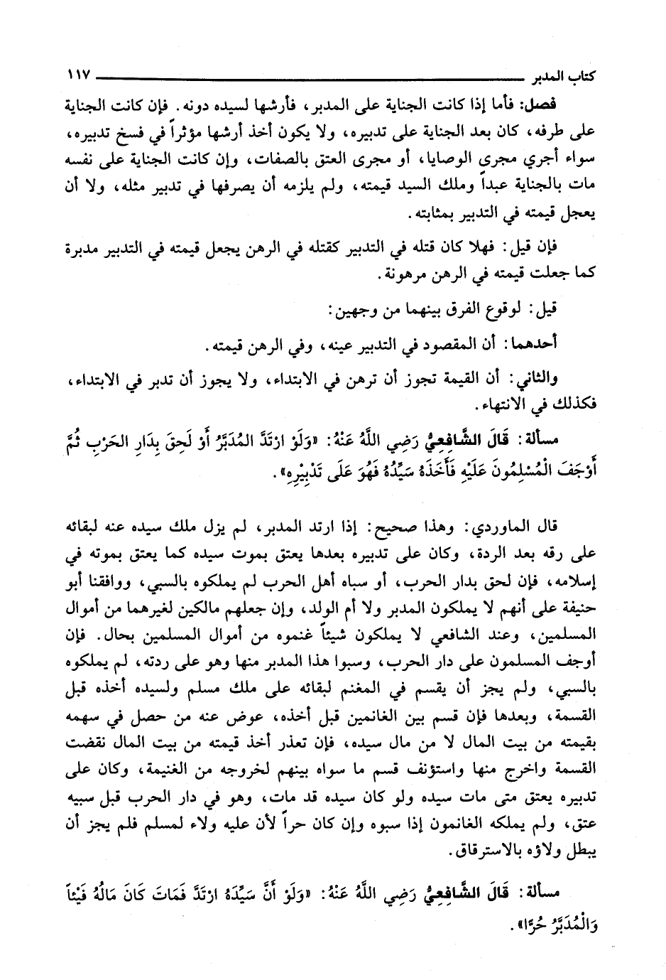 قَالَ الْمَاوَرْدِيُّ: وَهَذَا صَحِيحٌ: إِذَا ارْتَدَّ الْمُدَبَّر، لَمْ يَزُلْ مِلْكُ سَيِّدِهِ عَنْهُ لِبَقَائِهِ عَلَى رِقِّهِ بَعْدَ الرِّدَّةِ، وَكَانَ عَلَى تَدْبِيرِهِ بَعْدَهَا يُعْتَقُ بِمَوْتِ سَيِّدِهِ كَمَا يُعْتَقُ بِمَوْتِهِ فِي إِسْلَامِهِ، فَإِنْ لَحِقَ بِدَارِ الْحَرْبِ، أَوْ سَبَاهُ أَهْلُ الْحَرْبِ لَمْ يَمْلِكُوهُ بِالسَّبْيِ، وَوَافَقَنَا أَبُو حَنِيفَةَ عَلَى أَنَّهُمْ لَا يَمْلِكُونَ الْمُدَبَّر وَلَا أُمَّ الْوَلَدِ، وَإِنْ جَعَلَهُمْ مَالِكِينَ لِغَيْرِهِمَا مِنْ أَمْوَالِ الْمُسْلِمِينَ، وَعِنْدَ الشَّافِعِيِّ لَا يَمْلِكُونَ شَيْئًا غَنِمُوهُ مِنْ أَمْوَالِ الْمُسْلِمِينَ بِحَالٍ. فَإِنْ أَوَجَفَ الْمُسْلِمُونَ عَلَى دَارِ الْحَرْبِ، وَسَبَوْا هَذَا الْمُدَبَّر مِنْهَا وَهُوَ عَلَى رِدَّتِهِ، لَمْ يَمْلِكُوهُ بِالسَّبْيِ، وَلَمْ يَجُزْ أَنْ يُقْسَمَ فِي الْمَغْنَمِ لِبَقَائِهِ عَلَى مِلْكِ مُسْلِمٍ وَلِسَيِّدِهِ أَخْذُهُ قَبْلَ الْقِسْمَةِ، وَبَعْدَهَا فَإِنْ قُسِمَ بَيْنَ الْغَانِمِينَ قَبْلَ أَخْذِهِ، عُوِّضَ عَنْهُ مَنْ حَصَلَ فِي سَهْمِهِ بِقِيمَتِهِ مِنْ بَيْتِ الْمَالِ لَا مِنْ مَالِ سَيِّدِهِ، فَإِنْ تَعَذَّرَ أَخْذُ قِيمَتِهِ مِنْ بَيْتِ الْمَالِ نُقِضَتِ الْقِسْمَةُ وَأُخْرِجَ مِنْهَا وَاسْتُؤْنِفَ قَسْمُ مَا سِوَاهُ بَيْنَهُمْ لِخُرُوجِهِ مِنَ الْغَنِيمَةِ، وَكَانَ عَلَى تَدْبِيرِهِ يُعْتَقُ مَتَى مَاتَ سَيِّدُهُ وَلَوْ كَانَ سَيِّدُهُ قَدْ مَاتَ، وَهُوَ فِي دَارِ الْحَرْبِ قَبْلَ سَبْيِهِ عَتَقَ، وَلَمْ يَمْلِكْهُ الْغَانِمُونَ إِذَا سَبَوْهُ وَإِنْ كَانَ حُرًّا لِأَنَّ عَلَيْهِ وَلَاءً لِمُسْلِمٍ فَلَمْ يَجُزْ أَنْ يَبْطُلَ ولاؤه بالاسترقاق.