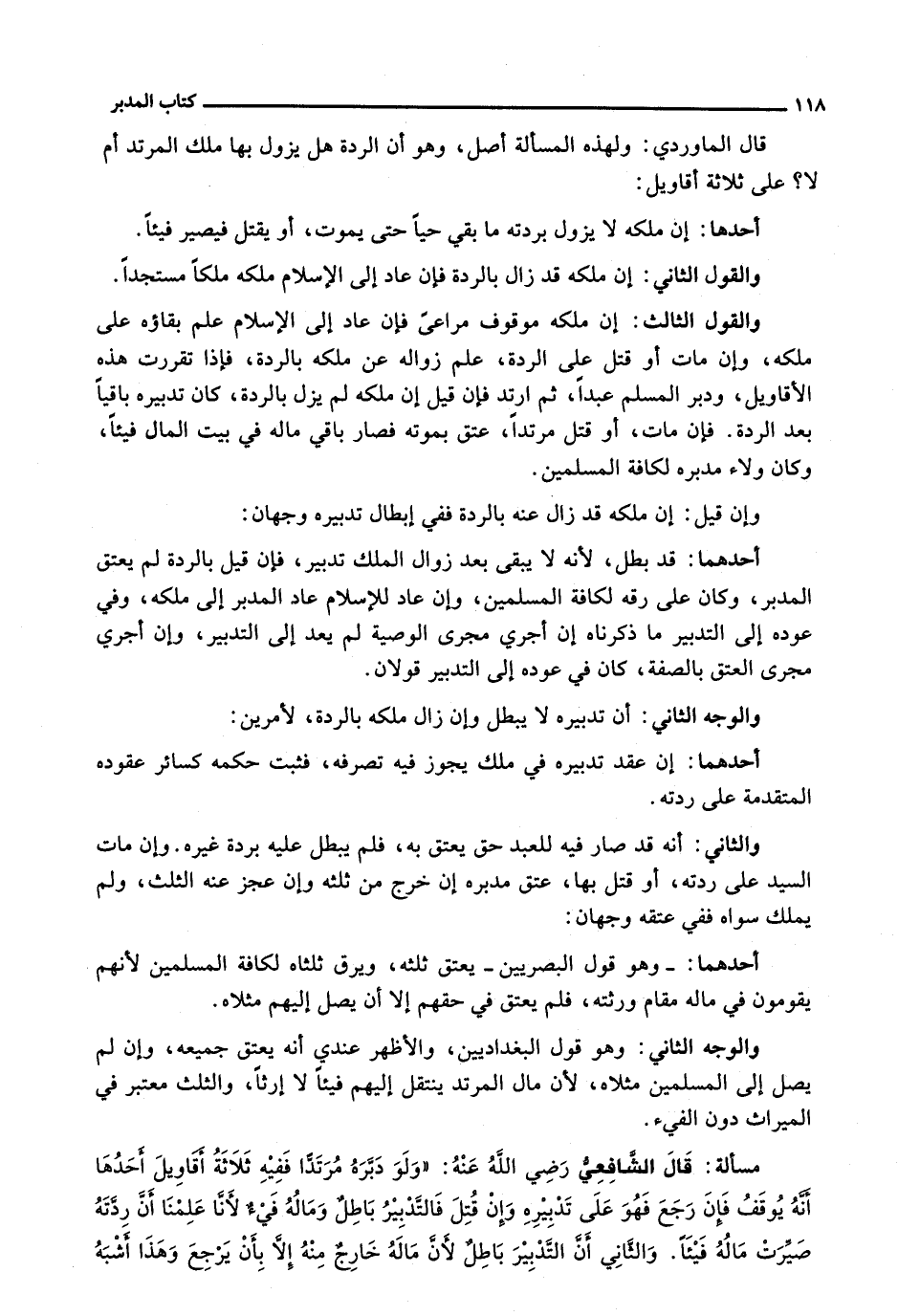 قال الشافعي رضي الله عنه: (وَلَوْ دَبَّرَهُ مُرْتَدًّا فَفِيهِ ثَلَاثَةُ أَقَاوِيلَ أَحَدُهَا أَنَّهُ يُوقَفُ فَإِنْ رَجَعَ فَهُوَ عَلَى تَدْبِيرِهِ، وَإِنْ قُتِلَ فَالتَّدْبِيرُ بَاطِلٌ وَمَالُهُ فَيْءٌ لِأَنَّا عَلِمْنَا أَنَّ رِدَّتَهُ صَيَّرَتْ مَالَهُ فَيْئًا. وَالثَّانِي أَنَّ التَّدْبِيرَ بَاطِلٌ لِأَنَّ مَالَهُ خَارِجٌ مِنْهُ إِلَّا بِأَنْ يَرْجِعَ وَهَذَا أَشْبَهُ