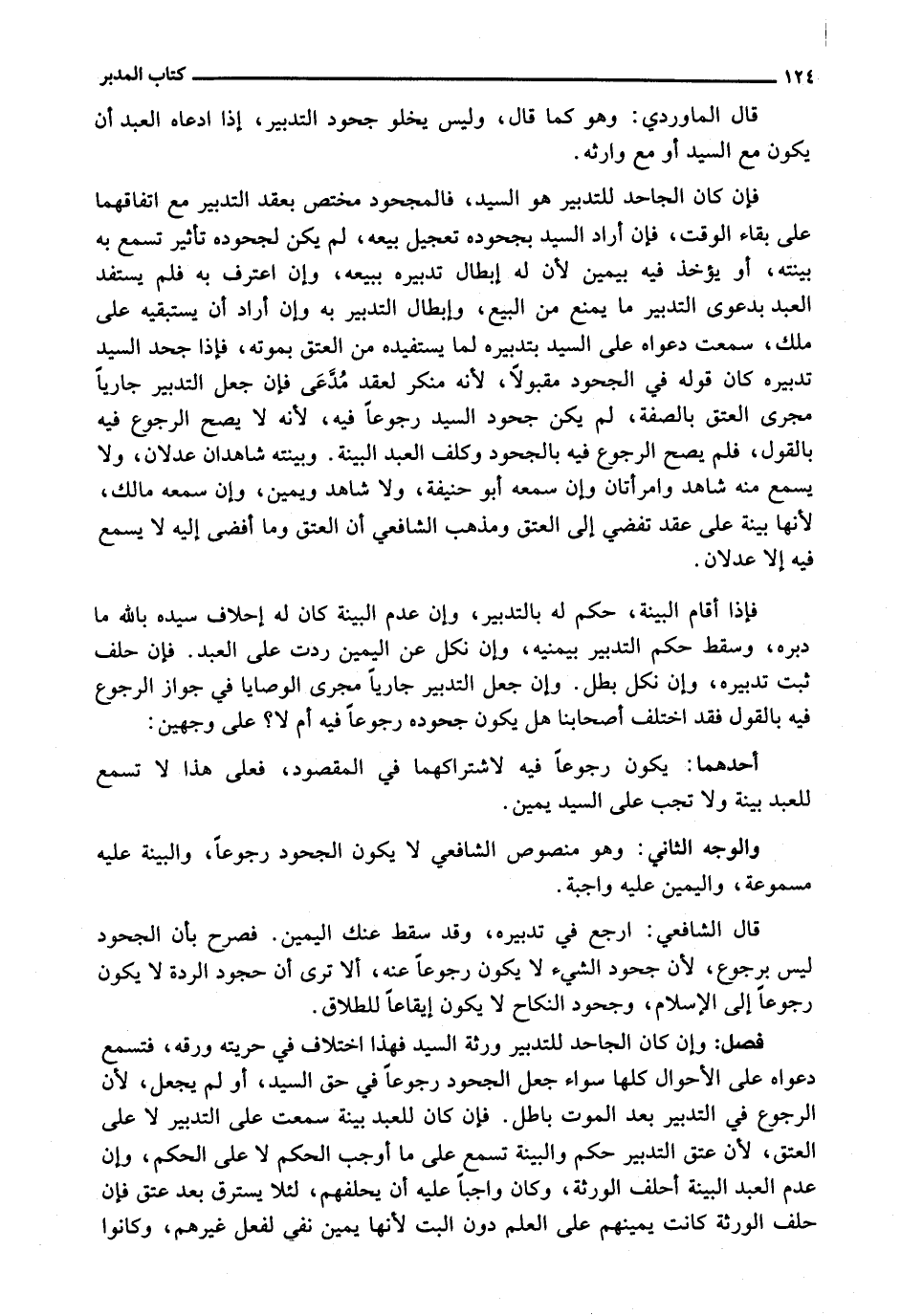 فَإِنْ كَانَ الْجَاحِدُ لِلتَّدْبِيرِ هُوَ السَّيِّدَ، فَالْمَجْحُودُ مُخْتَصٌّ بِعَقْدِ التَّدْبِيرِ مَعَ اتِّفَاقِهِمَا عَلَى بَقَاءِ الْوَقْتِ، فَإِنْ أَرَادَ السَّيِّدُ بِجُحُودِهِ تَعْجِيلَ بَيْعِهِ، لَمْ يَكُنْ لِجُحُودِهِ تَأْثِيرٌ تُسْمَعُ بِهِ بَيِّنَتُهُ، أَوْ يُؤْخَذُ فِيهِ بِيَمِينٍ لِأَنَّ لَهُ إِبْطَالَ تَدْبِيرِهِ بِبَيْعِهِ، وَإِنِ اعْتَرَفَ بِهِ فَلَمْ يَسْتَفِدِ الْعَبْدُ بِدَعْوَى التَّدْبِيرِ مَا يَمْنَعُ مِنَ الْبَيْعِ، وَإِبْطَالِ التَّدْبِيرِ بِهِ وَإِنْ أَرَادَ أَنْ يَسْتَبْقِيَهُ عَلَى مِلْكٍ، سُمِعَتْ دَعْوَاهُ عَلَى السَّيِّدِ بِتَدْبِيرِهِ لِمَا يَسْتَفِيدُهُ مِنَ الْعِتْقِ بِمَوْتِهِ، فَإِذَا جَحَدَ السَّيِّدُ تَدْبِيرَهُ كَانَ قَوْلُهُ فِي الْجُحُودِ مَقْبُولًا، لِأَنَّهُ مُنْكِرٌ لِعَقْدٍ مُدَّعًى فَإِنْ جَعَلَ التَّدْبِيرَ جَارِيًا مَجْرَى الْعِتْقِ بِالصِّفَةِ، لَمْ يَكُنْ جُحُودُ السَّيِّدِ رُجُوعًا فِيهِ، لِأَنَّهُ لَا يَصِحُّ الرُّجُوعُ فِيهِ بِالْقَوْلِ، فَلَمْ يَصِحَّ الرُّجُوعُ فِيهِ بِالْجُحُودِ وَكُلِّفَ الْعَبْدُ الْبَيِّنَةَ. وَبَيِّنَتُهُ شَاهِدَانِ عَدْلَانِ، وَلَا يُسْمَعُ مِنْهُ شَاهِدٌ وَامْرَأَتَانِ وَإِنْ سِمِعَهُ أَبُو حَنِيفَةَ، وَلَا شَاهِدٌ وَيَمِينٌ، وَإِنْ سَمِعَهُ مَالِكٌ، لِأَنَّهَا بَيِّنَةٌ عَلَى عَقْدٍ تُفْضِي إِلَى الْعِتْقِ وَمَذْهَبُ الشَّافِعِيِّ أَنَّ الْعِتْقَ وَمَا أَفْضَى إِلَيْهِ لَا يُسْمَعُ فِيهِ إِلَّا عَدْلَانِ.