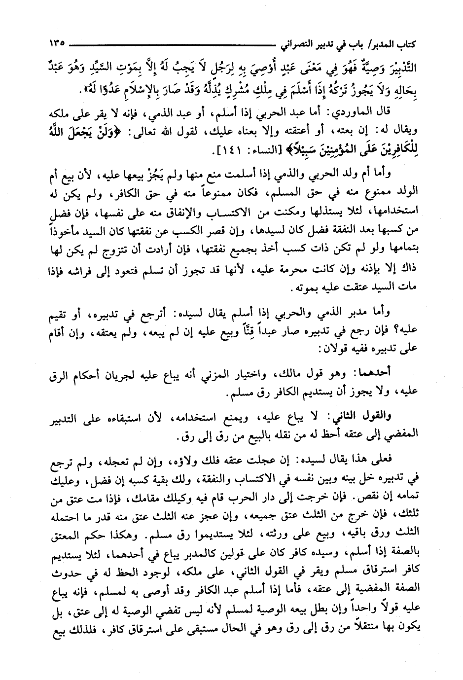 قَالَ الْمَاوَرْدِيُّ: أَمَّا عَبْدُ الْحَرْبِيِّ إِذَا أَسْلَمَ، أَوْ عَبْدُ الذِّمِّيِّ، فَإِنَّهُ لَا يُقَرُّ عَلَى مِلْكِهِ وَيُقَالُ لَهُ: إِنْ بِعْتَهُ، أَوْ أَعْتَقْتَهُ، وَإِلَّا بِعْنَاهُ عَلَيْكَ، لِقَوْلِ اللَّهِ تَعَالَى: {وَلَنْ يَجْعَلَ اللَّهُ لِلْكَافِرِينَ عَلَى الْمُؤْمِنِينَ سَبِيلا} [النساء: 141] .