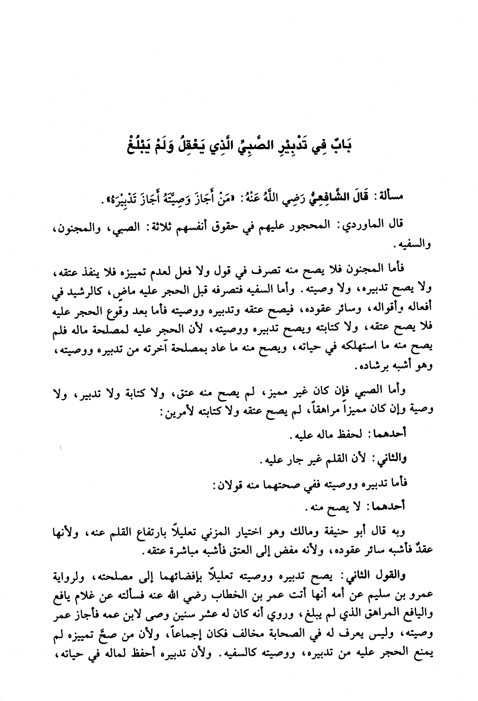 فَأَمَّا الْمَجْنُونُ فَلَا يَصِحُّ مِنْهُ تَصَرُّفٌ فِي قَوْلٍ وَلَا فِعْلٍ لِعَدَمِ تَمْيِيزِهِ فَلَا يُنَفَّذُ عِتْقُهُ، وَلَا يَصِحُّ تَدْبِيرُهُ، وَلَا وَصِيَّتُهُ. وَأَمَّا السَّفِيهُ فَتَصَرُّفُهُ قَبْلَ الْحَجْرِ عَلَيْهِ مَاضٍ، كَالرَّشِيدِ فِي أَفْعَالِهِ وأَقْوَالِهِ، وَسَائِرِ عُقُودِهِ، فَيَصِحُّ عِتْقُهُ وَتَدْبِيرُهُ وَوَصِيَّتُهُ فَأَمَّا بَعْدَ وُقُوعِ الْحَجْرِ عَلَيْهِ فَلَا يَصِحُّ عِتْقُهُ، وَلَا كِتَابَتُهُ وَيَصِحُّ تَدْبِيرُهُ وَوَصِيَّتُهُ، لِأَنَّ الْحَجْرَ عَلَيْهِ لِمَصْلَحَةِ مَالِهِ فَلَمْ يَصِحَّ مِنْهُ مَا اسْتَهْلَكَهُ فِي حَيَاتِهِ، وَيَصِحُّ مِنْهُ مَا عَادَ بِمَصْلَحَةِ آخِرَتِهِ مِنْ تَدْبِيرِهِ وَوَصِيَّتِهِ، وَهُوَ أَشْبَهُ بِرَشَادِهِ.