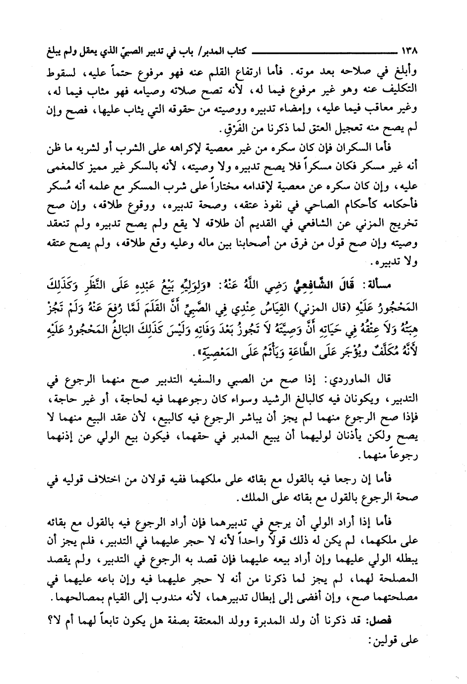 وَأَبْلَغُ فِي صَلَاحِهِ بَعْدَ مَوْتِهِ. فَأَمَّا ارْتِفَاعُ الْقَلَمِ عَنْهُ فَهُوَ مَرْفُوعٌ حَتْمًا عَلَيْهِ، لِسُقُوطِ التَّكْلِيفِ عَنْهُ وَهُوَ غَيْرُ مَرْفُوعٍ فِيمَا لَهُ، لِأَنَّهُ تَصِحُّ صَلَاتُهُ وَصِيَامُهُ فَهُوَ مُثَابٌ فِيمَا لَهُ، وَغَيْرُ مُعَاقَبٍ فِيمَا عَلَيْهِ، وَإِمْضَاءُ تَدْبِيرِهِ وَوَصِيَّتِهِ مِنْ حُقُوقِهِ الَّتِي يُثَابُ عَلَيْهَا، فَصَحَّ وَإِنْ لَمْ يَصِحَّ مِنْهُ تَعْجِيلُ الْعِتْقِ لِمَا ذَكَرْنَا مِنَ الْفَرْقِ.