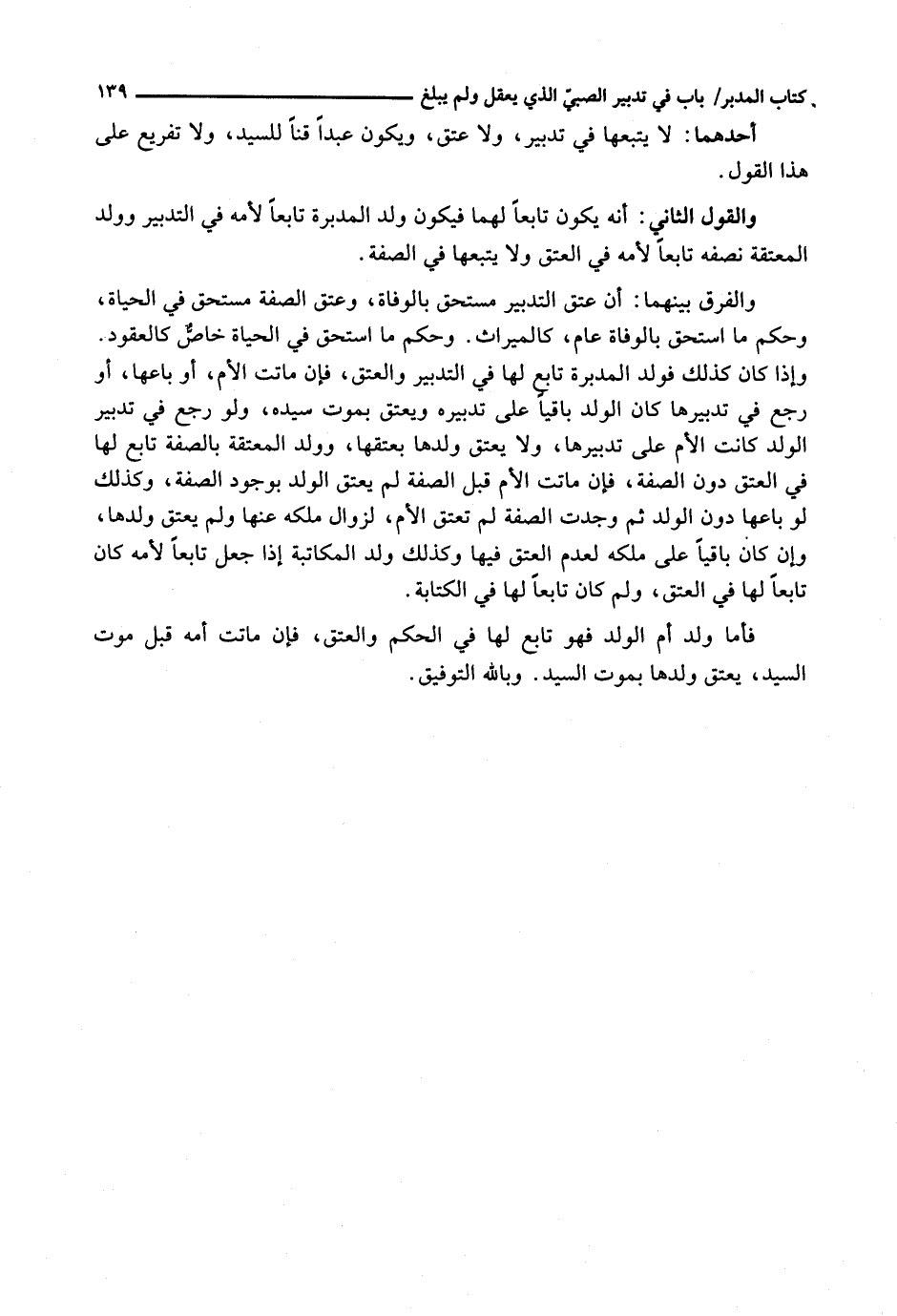 وَالْقَوْلُ الثَّانِي: أَنَّهُ يَكُونُ تَابِعًا لَهُمَا فَيَكُونُ وَلَدُ الْمُدَبَّرةِ تَابِعًا لِأُمِّهِ فِي التَّدْبِيرِ وَوَلَدُ الْمُعْتَقَةِ نِصْفُهُ تَابِعًا لِأُمِّهِ فِي الْعِتْقِ وَلَا يَتْبَعُهَا فِي الصِّفَةِ.