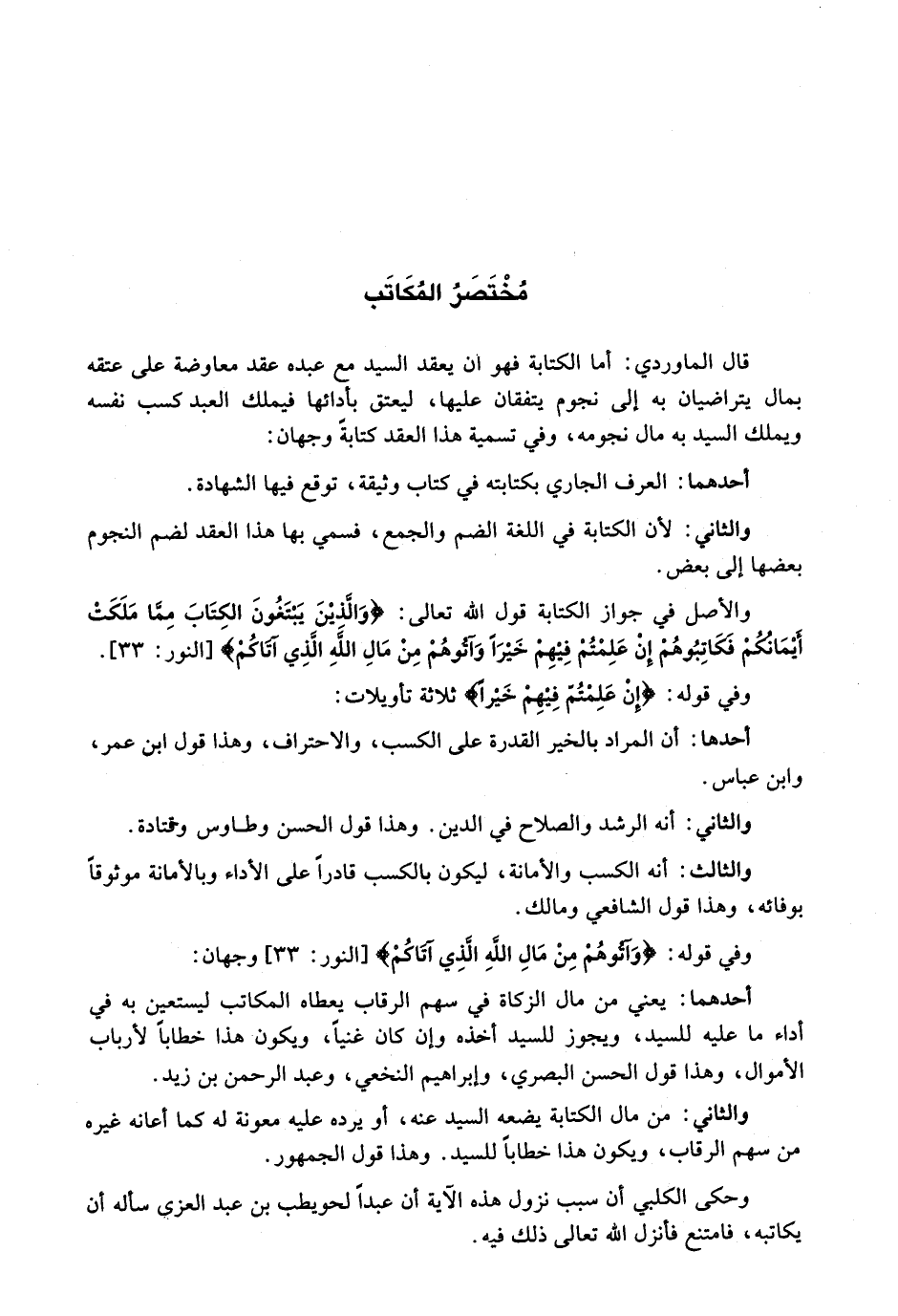 قَالَ الْمَاوَرْدِيُّ: أَمَّا الْكِتَابَةُ فَهُوَ أَنْ يعقد السيد مع عبده عقد معاوضة في عِتْقِهِ بِمَالٍ يَتَرَاضَيَانِ بِهِ إِلَى نُجُومٍ يَتَّفِقَانِ عَلَيْهَا، لِيُعْتَقَ بِأَدَائِهَا فَيَمْلِكُ الْعَبْدُ كَسْبَ نَفْسِهِ وَيَمْلِكُ السَّيِّدُ بِهِ مَالَ نُجُومِهِ، وَفِي تَسْمِيَةِ هَذَا الْعَقْدِ كِتَابَةً وَجْهَانِ: