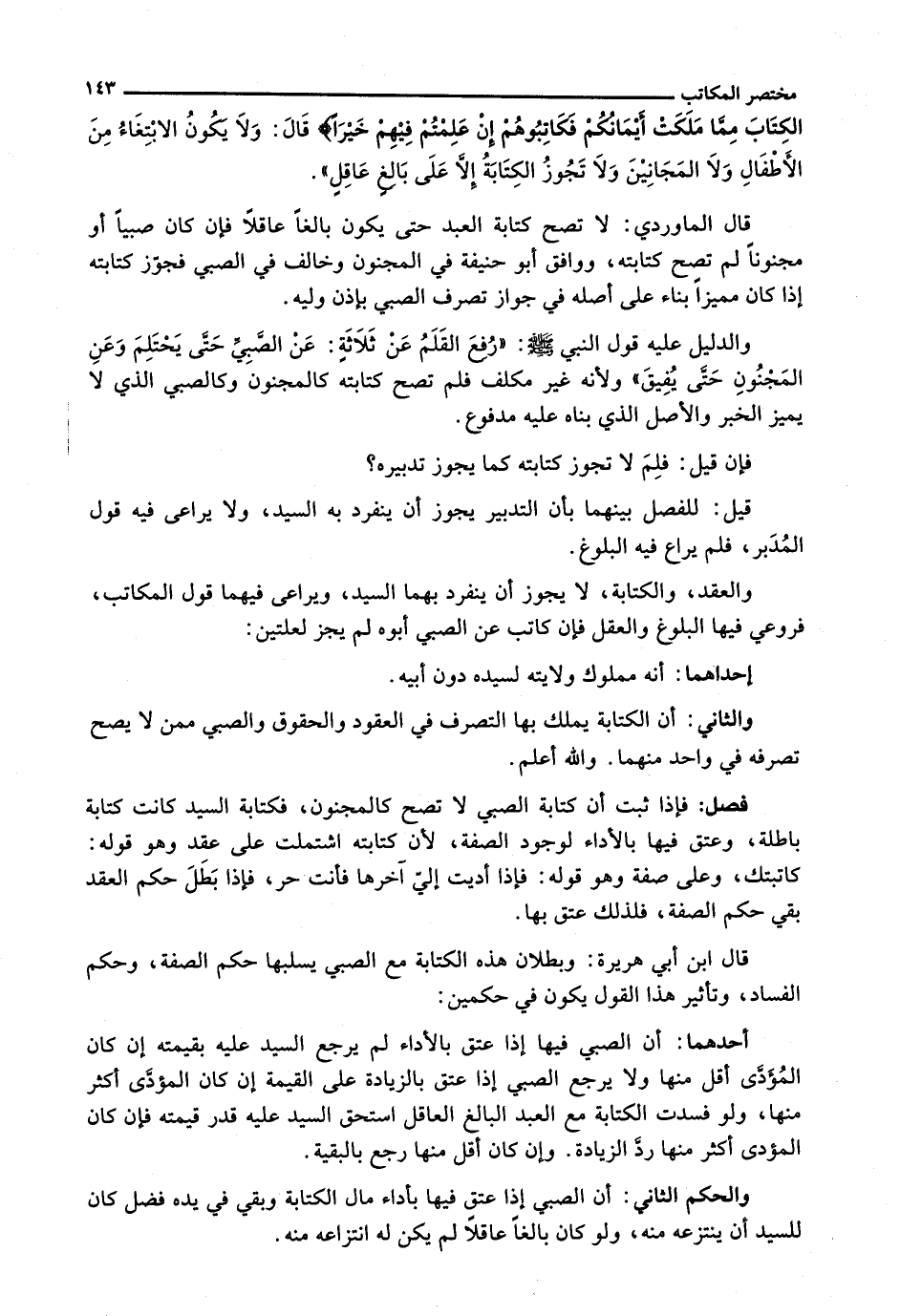 الْكِتَابَ مِمَّا مَلَكَتْ أَيْمَانُكُمْ فَكَاتِبُوهُمْ إِنْ عَلِمْتُمْ فيهم خيراً} قَالَ: وَلَا يَكُونُ الِابْتِغَاءُ مِنَ الْأَطْفَالِ وَلَا الْمَجَانِينَ وَلَا تَجُوزُ الْكِتَابَةُ إِلَّا عَلَى بَالِغٍ عَاقِلٍ) .