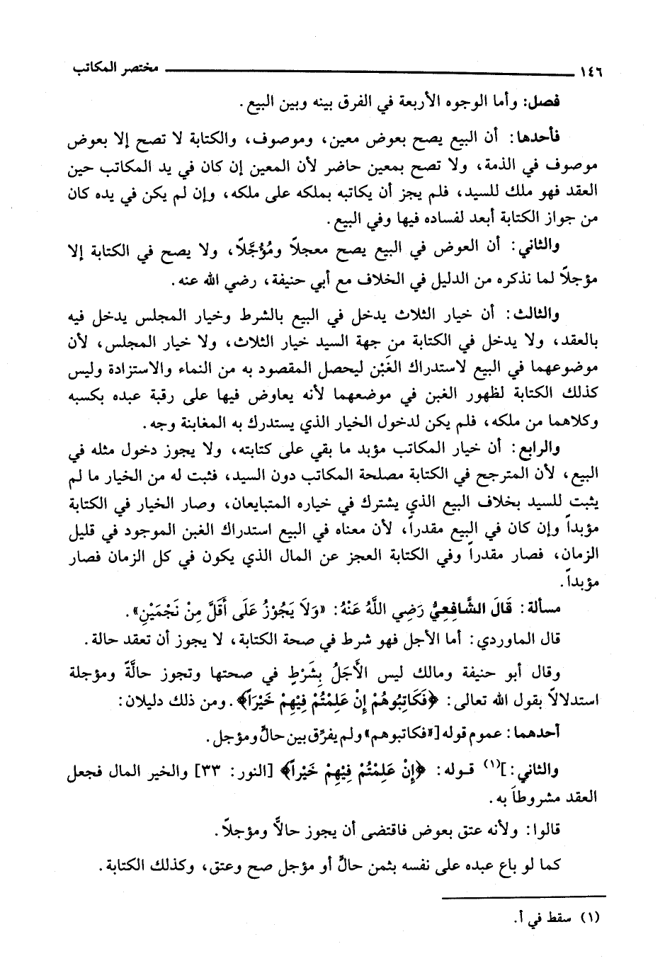 وَالثَّانِي: أَنَّ الْعِوَضَ فِي الْبَيْعِ يَصِحُّ مُعَجَّلًا وَمُؤَجَّلًا، وَلَا يَصِحُّ فِي الْكِتَابَةِ إِلَّا مُؤَجَّلًا لِمَا نَذْكُرُهُ مِنَ الدَّلِيلِ فِي الْخِلَافِ مَعَ أَبِي حَنِيفَةَ، رَضِيَ اللَّهُ عَنْهُ.