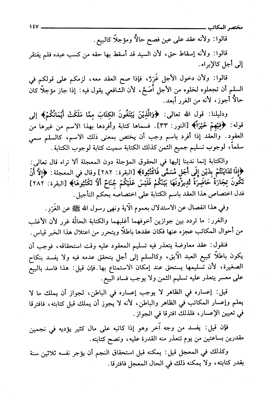 وَالْكِتَابَةُ إِنَّمَا نَدَبْنَا إِلَيْهَا فِي الْحُقُوقِ الْمُؤَجَّلَةِ دُونَ الْمُعَجَّلَةِ أَلَا تَرَاهُ قَالَ تَعَالَى: {إِذَا تَدَايَنْتُمْ بِدَيْنٍ إِلَى أَجَلٍ مُسَمًّى فَاكْتُبُوهُ} [البقرة: 282] وَقَالَ فِي الْمُعَجَّلَةِ: {إِلا أَنْ تَكُونَ تِجَارَةً حَاضِرَةً تُدِيرُونَهَا بَيْنَكُمْ فَلَيْسَ عَلَيْكُمْ جُنَاحٌ أَلا تَكْتُبُوهَا} [البقرة: 282] فَدَلَّ اخْتِصَاصُ هَذَا الْعَقْدِ بِاسْمِ الْكِتَابَةِ عَلَى اخْتِصَاصِهِ بِحُكْمِ التَّأْجِيلِ.