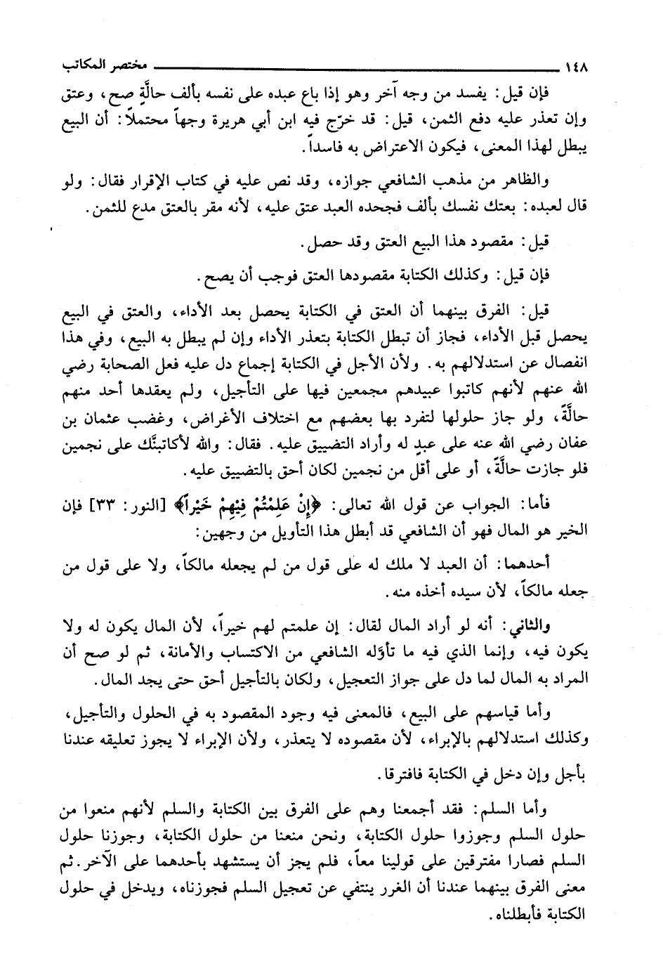 وَأَمَّا قِيَاسُهُمْ عَلَى الْبَيْعِ، فَالْمَعْنَى فِيهِ وُجُودُ الْمَقْصُودِ بِهِ فِي الْحُلُولِ وَالتَّأْجِيلِ، وَكَذَلِكَ اسْتِدْلَالُهُمْ بِالْإِبْرَاءِ، لِأَنَّ مَقْصُودَهُ لَا يَتَعَذَّرُ، وَلِأَنَّ الْإِبْرَاءَ لَا يَجُوزُ تَعْلِيقُهُ عِنْدَنَا بِأَجَلٍ وَإِنْ دَخَلَ فِي الْكِتَابَةِ فَافْتَرَقَا.