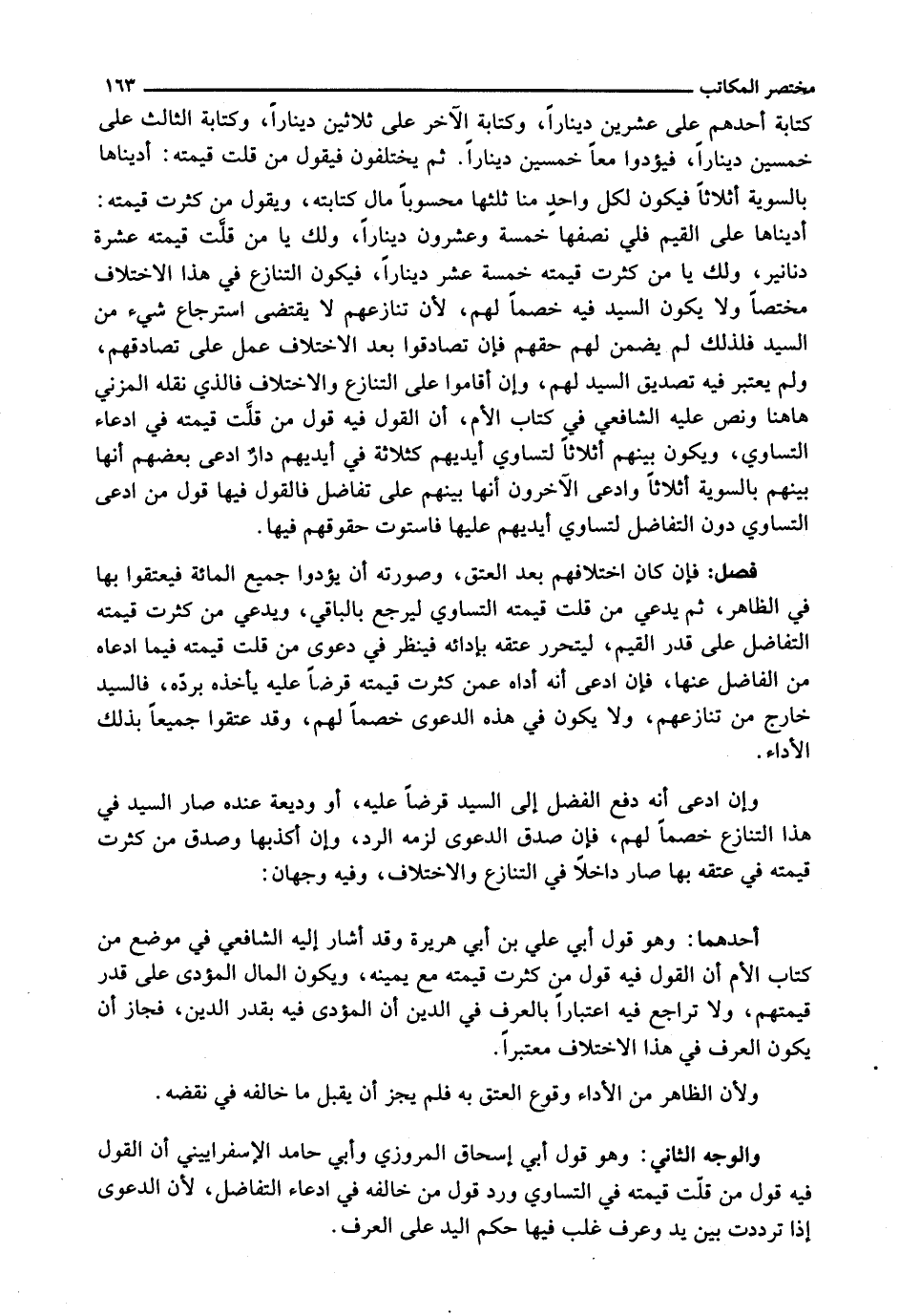 كِتَابَةَ أَحَدِهِمْ عَلَى عِشْرِينَ دِينَارًا، وَكِتَابَةَ الْآخَرِ عَلَى ثَلَاثِينَ دِينَارًا، وَكِتَابَةَ الثَّالِثِ عَلَى خَمْسِينَ دِينَارًا، فَيُؤَدُّوا مَعًا خَمْسِينَ دِينَارًا. ثُمَّ يَخْتَلِفُونَ فَيَقُولُ مَنْ قَلَّتْ قِيمَتُهُ: أَدَّيْنَاهَا بِالسَّوِيَّةِ أَثْلَاثًا فَيَكُونُ لِكُلِّ وَاحِدٍ مِنَّا ثُلُثُهَا مَحْسُوبًا مَالَ كِتَابَتِهِ، وَيَقُولُ مَنْ كَثُرَتْ قِيمَتُهُ: أَدَّيْنَاهَا عَلَى الْقِيَمِ فَلِي نِصْفُهَا خَمْسَةٌ وَعِشْرُونَ دِينَارًا، وَلَكَ يَا مَنْ قَلَّتْ قِيمَتُهُ عَشَرَةُ دَنَانِيرَ، وَلَكَ يَا مَنْ كَثُرَتْ قِيمَتُهُ خَمْسَةَ عَشَرَ دِينَارًا، فَيَكُونُ التَّنَازُعُ فِي هَذَا الِاخْتِلَافِ مُخْتَصًّا وَلَا يَكُونُ السَّيِّدُ فِيهِ خَصْمًا لَهُمْ، لِأَنَّ تَنَازُعَهُمْ لَا يَقْتَضِي اسْتِرْجَاعَ شَيْءٍ مِنَ السَّيِّدِ فَلِذَلِكَ لَمْ يَضْمَنْ لَهُمْ حَقَّهُمْ فَإِنْ تَصَادَقُوا بَعْدَ الِاخْتِلَافِ عَمِلَ عَلَى تُصَادِقِهِمْ، وَلَمْ يُعْتَبَرْ فِيهِ تَصْدِيقُ السَّيِّدِ لَهُمْ، وَإِنْ أَقَامُوا عَلَى التَّنَازُعِ وَالِاخْتِلَافِ فَالَّذِي نَقَلَهُ الْمُزَنِيُّ هَاهُنَا وَنَصَّ عَلَيْهِ الشَّافِعِيُّ فِي كِتَابِ الْأُمِّ، أَنَّ الْقَوْلَ فِيهِ قَوْلُ مَنْ قَلَّتْ قِيمَتُهُ فِي ادِّعَاءِ التَّسَاوِي، وَيَكُونُ بَيْنَهُمْ أَثْلَاثًا لِتَسَاوِي أَيْدِيهِمْ كَثَلَاثَةٍ فِي أَيْدِيهِمْ دَارٌ ادَّعَى بَعْضُهُمْ أَنَّهَا بَيْنَهُمْ بِالسَّوِيَّةِ أَثْلَاثًا وَادَّعَى الْآخَرُونَ أَنَّهَا بَيْنَهُمْ عَلَى تُفَاضُلٍ فَالْقَوْلُ فِيهَا قَوْلُ مَنِ ادَّعَى التَّسَاوِيَ دُونَ التَّفَاضُلِ لِتَسَاوِي أَيْدِيهِمْ عَلَيْهَا فَاسْتَوَتْ حُقُوقُهُمْ فِيهَا.