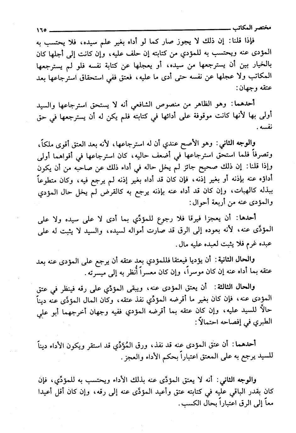 وَالوجهُّ الثَّانِي: وَهُوَ الْأَصَحُّ عِنْدِي أَنَّ لَهُ اسْتِرْجَاعَهَا، لِأَنَّهُ بَعْدَ الْعِتْقِ أَقْوَى مِلْكًا، وَتَصَرُّفًا فَلَمَّا اسْتَحَقَّ اسْتِرْجَاعَهَا فِي أَضْعَفِ حَالَيْهِ، كَانَ اسْتِرْجَاعُهَا فِي أَقْوَاهُمَا أَوْلَى وَإِذَا قُلْنَا: إِنَّ ذَلِكَ صَحِيحٌ جَائِزٌ لَمْ يَخْلُ حَالُهُ فِي أَدَاءِ ذَلِكَ عَنْ صَاحِبِهِ مِنْ أَنْ يَكُونَ أَدَاؤُهُ عَنْهُ بِإِذْنِهِ أَوْ بِغَيْرِ إِذْنِهِ، فَإِنْ كَانَ قَدْ أَدَّاهُ بِغَيْرِ إِذْنِهِ لَمْ يَرْجِعْ فِيهِ، وَكَانَ مُتَطَوِّعًا بِبَذْلِهِ كَالْهِبَاتِ، وَإِنْ كَانَ قَدْ أَدَّاهُ عَنْهُ بِإِذْنِهِ يَرْجِعُ بِهِ كَالْقَرْضِ لَمْ يَخْلُ حَالُ الْمُؤَدِّي وَالْمُؤَدَّى عَنْهُ من أربعة أَحْوَالٍ: