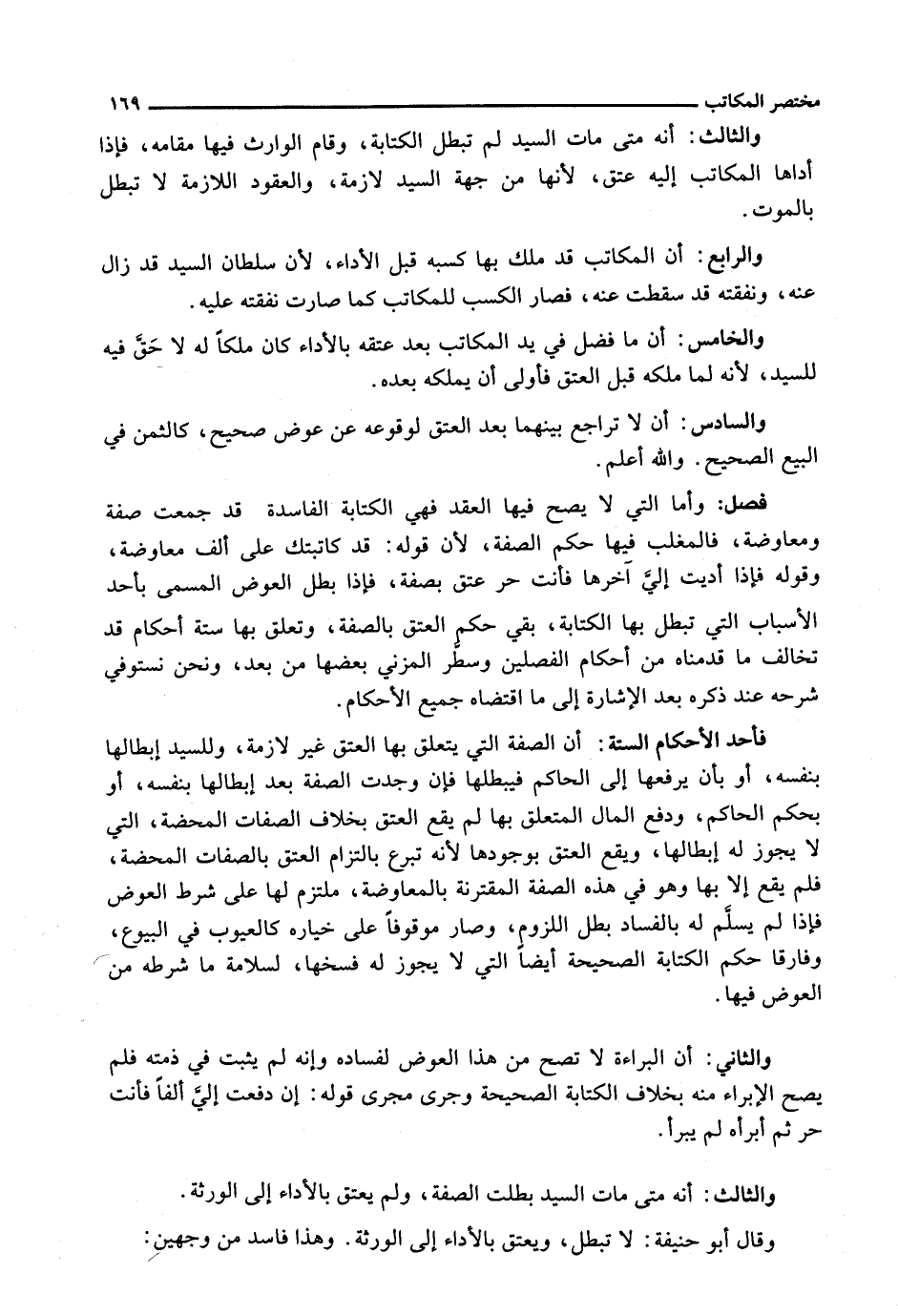 وَأَمَّا الَّتِي لَا يَصِحُّ فِيهَا الْعَقْدُ فَهِيَ الْكِتَابَةُ الْفَاسِدَةُ قَدْ جَمَعَتْ صِفَةً وَمُعَاوَضَةً، فَالْمُغَلَّبُ فِيهَا حُكْمُ الصِّفَةِ، لِأَنَّ قَوْلَهُ: قَدْ كَاتَبْتُكَ عَلَى أَلْفٍ مُعَاوَضَةً، وَقَوْلَهُ فَإِذَا أَدَّيْتَ إِلَيَّ آخِرَهَا فَأَنْتَ حُرٌّ عِتْقٌ بِصِفَةٍ، فَإِذَا بَطَلَ الْعِوَضُ الْمُسَمَّى بِأَحَدِ الْأَسْبَابِ الَّتِي تَبْطُلُ بِهَا الْكِتَابَةُ، بَقِيَ حُكْمُ الْعِتْقِ بِالصِّفَةِ، وَتَعَلَّقَ بِهَا سِتَّةُ أَحْكَامٍ قَدْ تُخَالِفُ مَا قَدَّمْنَاهُ مِنْ أَحْكَامِ الْفَصْلَيْنِ وَسَطَّرَ الْمُزَنِيُّ بَعْضَهَا مِنْ بَعْدُ، وَنَحْنُ نَسْتَوْفِي شَرْحَهُ عِنْدَ ذِكْرِهِ بَعْدَ الْإِشَارَةِ إِلَى مَا اقْتَضَاهُ جَمِيعُ الْأَحْكَامِ.