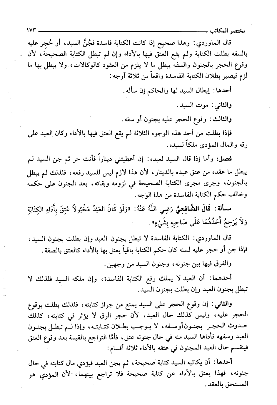 قَالَ الْمَاوَرْدِيُّ: وَهَذَا صَحِيحٌ إِذَا كَانَتِ الْكِتَابَةُ فَاسِدَةً فَجُنَّ السَّيِّدُ، أَوْ حُجِرَ عَلَيْهِ بِالسَّفَهِ بَطَلَتِ الْكِتَابَةُ وَلَمْ يَقَعِ الْعِتْقُ فِيهَا بِالْأَدَاءِ وَإِنْ لَمْ تَبْطُلِ الْكِتَابَةُ الصَّحِيحَةُ، لِأَنَّ وُقُوعَ الْحَجْرِ بِالْجُنُونِ وَالسَّفَهِ يُبْطِلُ مَا لَا يَلْزَمُ مِنَ الْعُقُودِ كَالْوِكَالَاتِ، وَلَا يُبْطِلُ بِهَا مَا لَزِمَ فَيَصِيرُ بُطْلَانُ الْكِتَابَةِ الْفَاسِدَةِ وَاقِعًا مِنْ ثَلَاثَةِ أَوْجُهٍ: