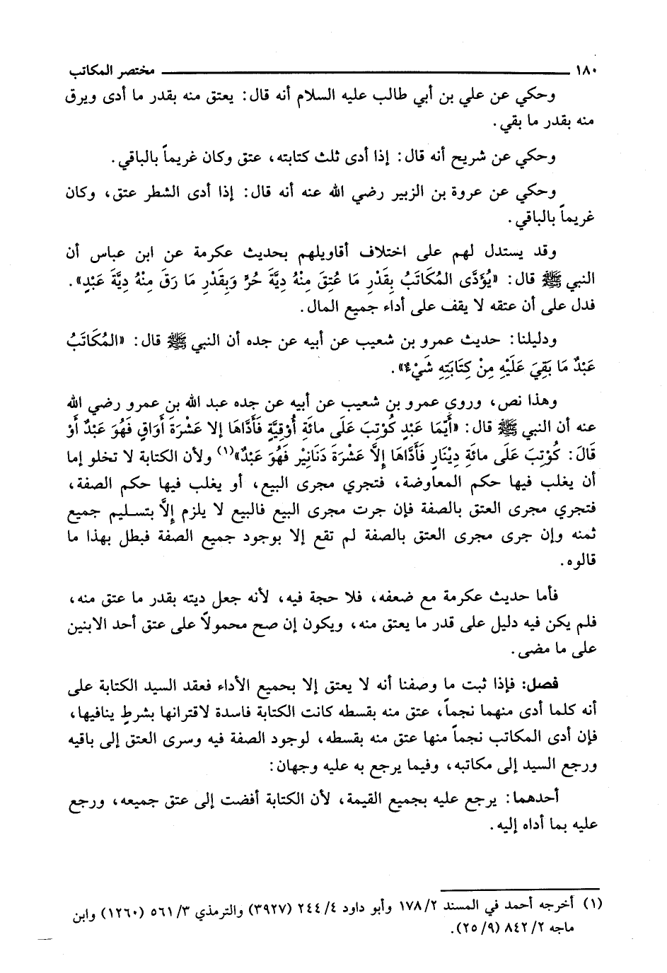 وَهَذَا نَصٌّ، وَرَوَى عَمْرُو بْنُ شُعَيْبٍ عَنْ أَبِيهِ عَنْ جَدِّهِ عَبْدِ اللَّهِ بْنِ عَمْرٍو رَضِيَ اللَّهُ عَنْهُ أَنَّ النَّبِيَّ - صَلَّى اللَّهُ عَلَيْهِ وَسَلَّم َ - قَالَ: " أَيُّمَا عَبْدٍ كُوتِبَ عَلَى مِائَةِ أُوقِيَّةٍ فَأَدَّاهَا إِلَّا عَشَرَةَ أَوَاقٍ فَهُوَ عَبْدٌ أَوْ قَالَ: كُوتِبَ عَلَى مِائَةِ دِينَارٍ فَأَدَّاهَا إِلَّا عَشَرَةَ دَنَانِيرَ فَهُوَ عَبْدٌ " وَلِأَنَّ الْكِتَابَةَ لَا تَخْلُو إِمَّا أَنْ يَغْلِبَ فِيهَا حُكْمُ الْمُعَاوَضَةِ، فَتَجْرِيَ مَجْرَى الْبَيْعِ، أَوْ يَغْلِبَ فِيهَا حُكْمُ الصِّفَةِ، فَتَجْرِيَ مَجْرَى الْعِتْقِ بِالصِّفَةِ فَإِنْ جَرَتْ مَجْرَى الْبَيْعِ فَالْبَيْعُ لَا يَلْزَمُ إِلَّا بِتَسْلِيمِ جَمِيعِ ثَمَنِهِ وَإِنْ جَرَى مَجْرَى الْعِتْقِ بِالصِّفَةِ لَمْ تَقَعْ إِلَّا بِوُجُودِ جَمِيعِ الصِّفَةِ فَبَطَلَ بِهَذَا مَا قَالُوهُ.
