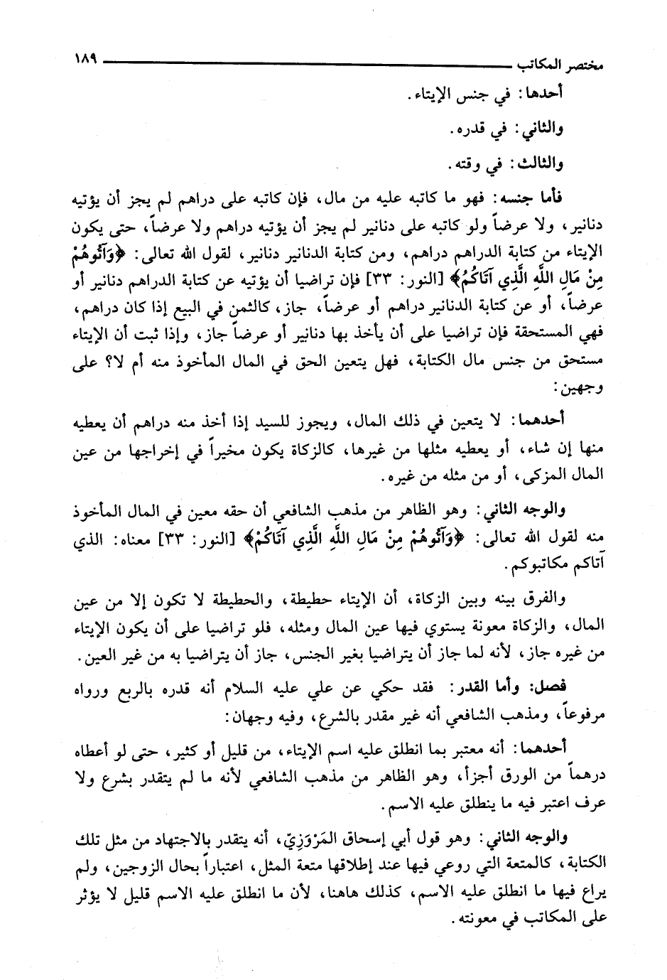 فَأَمَّا جِنْسُهُ: فَهُوَ مَا كَاتَبَهُ عَلَيْهِ مِنْ مَالٍ، فَإِنْ كَاتَبَهُ عَلَى دَرَاهِمَ لَمْ يَجُزْ أَنْ يُؤْتِيَهُ دَنَانِيرَ، وَلَا عَرْضًا وَلَوْ كَاتَبَهُ عَلَى دَنَانِيرَ لَمْ يَجُزْ أَنْ يُؤْتِيَهُ دَرَاهِمَ وَلَا عَرْضًا، حَتَّى يَكُونَ الْإِيتَاءُ مِنْ كِتَابَةِ الدَّرَاهِمِ دَرَاهِمَ، وَمِنْ كِتَابَةِ الدَّنَانِيرِ دَنَانِيرَ، لِقَوْلِ اللَّهِ تَعَالَى: {وَآتُوهُمْ مِنْ مَالِ اللَّهِ الَّذِي آتَاكُمْ} [النور: 33] فَإِنْ تَرَاضَيَا أَنْ يُؤْتِيَهُ عَنْ كِتَابَةِ الدَّرَاهِمِ دَنَانِيرَ أَوْ عَرْضًا، أَوْ عَنْ كِتَابَةِ الدَّنَانِيرِ دَرَاهِمَ أَوْ عَرْضًا، جَازَ، كَالثَّمَنِ فِي الْبَيْعِ إِذَا كَانَ دَرَاهِمَ، فَهِيَ الْمُسْتَحَقَّةُ فَإِنْ تَرَاضَيَا عَلَى أَنْ يَأْخُذَ بِهَا دَنَانِيرَ أَوْ عَرْضًا جَازَ، وَإِذَا ثَبَتَ أَنَّ الْإِيتَاءَ مُسْتَحَقٌّ مِنْ جِنْسِ مَالِ الْكِتَابَةِ، فَهَلْ يَتَعَيَّنُ الْحَقُّ فِي الْمَالِ الْمَأْخُوذِ مِنْهُ أَمْ لَا؟ عَلَى وَجْهَيْنِ: