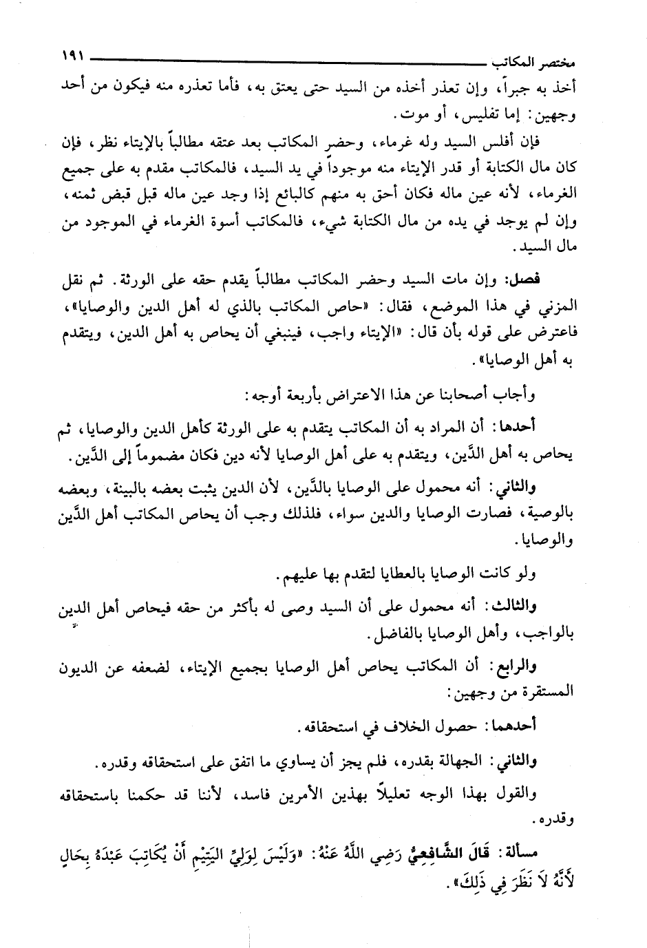 وَإِنْ مَاتَ السَّيِّدُ وَحَضَرَ الْمُكَاتَبُ مُطَالِبًا يُقَدَّمُ حَقُّهُ عَلَى الْوَرَثَةِ. ثُمَّ نَقَلَ الْمُزَنِيُّ فِي هَذَا الْمَوْضِعِ، فَقَالَ: (حَاصَّ الْمُكَاتَبُ بِالَّذِي لَهُ أَهْلُ الدَّيْنِ وَالْوَصَايَا) ، فَاعْتَرَضَ عَلَى قَوْلِهِ بِإِنْ قَالَ: (الْإِيتَاءُ وَاجِبٌ، فَيَنْبَغِي أَنْ يُحَاصَّ بِهِ أَهْلَ الدَّيْنِ، وَيَتَقَدَّمَ بِهِ أَهْلَ الْوَصَايَا) .