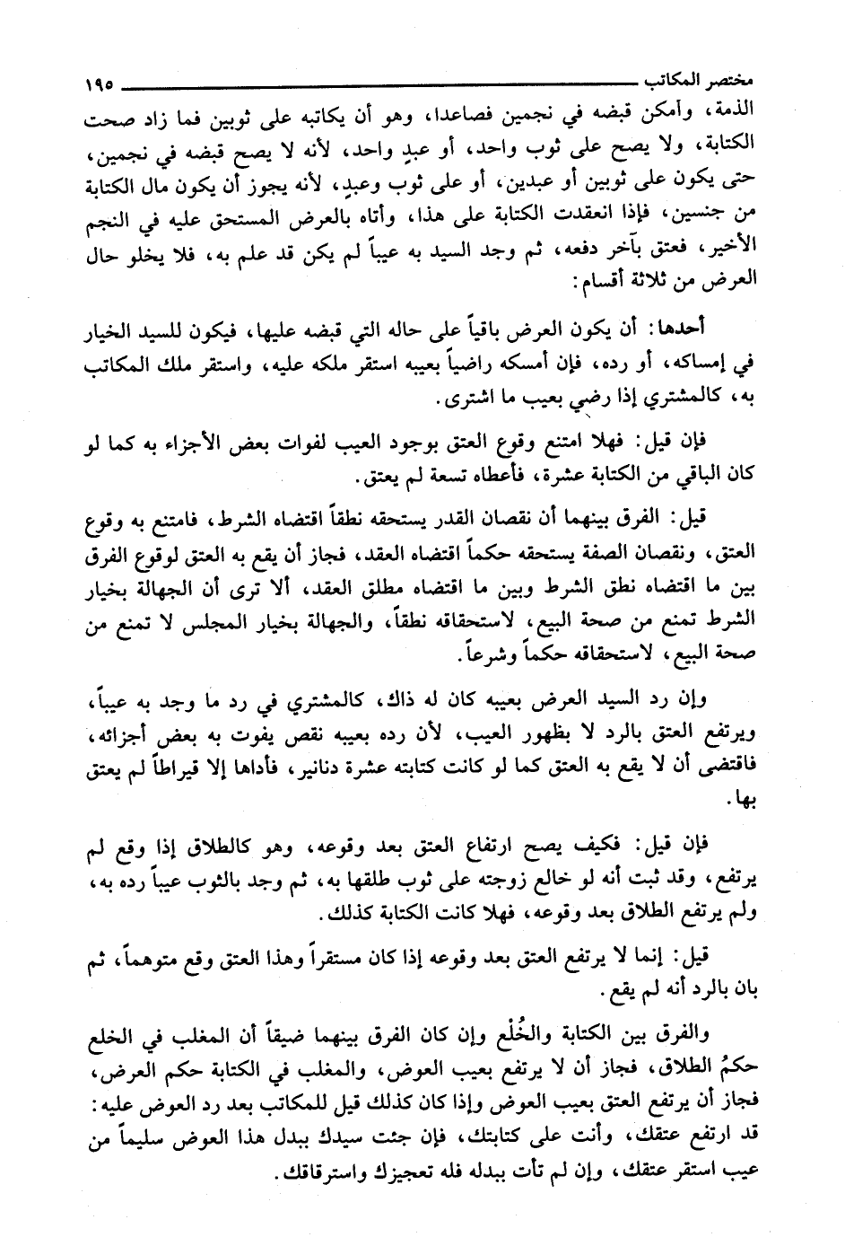 الذِّمَّةِ، وَأَمْكَنَ قَبْضُهُ فِي نَجْمَيْنِ فَصَاعِدًا وَهُوَ أَنْ يُكَاتِبَهُ عَلَى ثَوْبَيْنِ فَمَا زَادَ صَحَّتِ الْكِتَابَةُ، وَلَا يَصِحُّ عَلَى ثَوْبٍ وَاحِدٍ، أَوْ عَبْدٍ وَاحِدٍ، لِأَنَّهُ لَا يَصِحُّ قَبْضُهُ فِي نَجْمَيْنِ، حَتَّى يَكُونَ عَلَى ثَوْبَيْنِ أَوْ عَبْدَيْنِ، أَوْ عَلَى ثَوْبٍ وَعَبْدٍ، لِأَنَّهُ يَجُوزُ أَنْ يَكُونَ مَالُ الْكِتَابَةِ مِنْ جِنْسَيْنِ، فَإِذَا انْعَقَدَتِ الْكِتَابَةُ عَلَى هَذَا، وَأَتَاهُ بِالْعَرْضِ الْمُسْتَحَقِّ عَلَيْهِ فِي النَّجْمِ الْأَخِيرِ، فَعَتَقَ بِآخِرِ دَفْعِهِ، ثُمَّ وَجَدَ السَّيِّدُ بِهِ عَيْبًا لَمْ يَكُنْ قَدْ عَلِمَ بِهِ، فَلَا يَخْلُو حَالُ الْعَرْضِ مِنْ ثَلَاثَةِ أَقْسَامٍ: