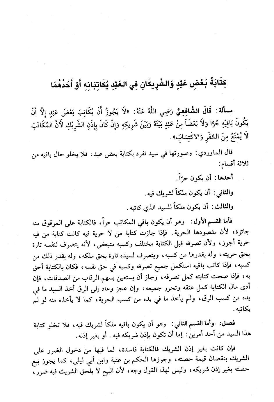 وَأَمَّا الْقِسْمُ الثَّانِي: وَهُوَ أَنْ يَكُونَ بَاقِيهِ مِلْكًا لِشَرِيكٍ فِيهِ، فَلَا تَخْلُو كِتَابَةُ هَذَا السَّيِّدِ مِنْ أَحَدِ أَمْرَيْنِ: إِمَّا أَنْ تَكُونَ بِإِذْنِ شَرِيكِهِ فِيهِ. أَوْ بِغَيْرِ إِذْنِهِ.