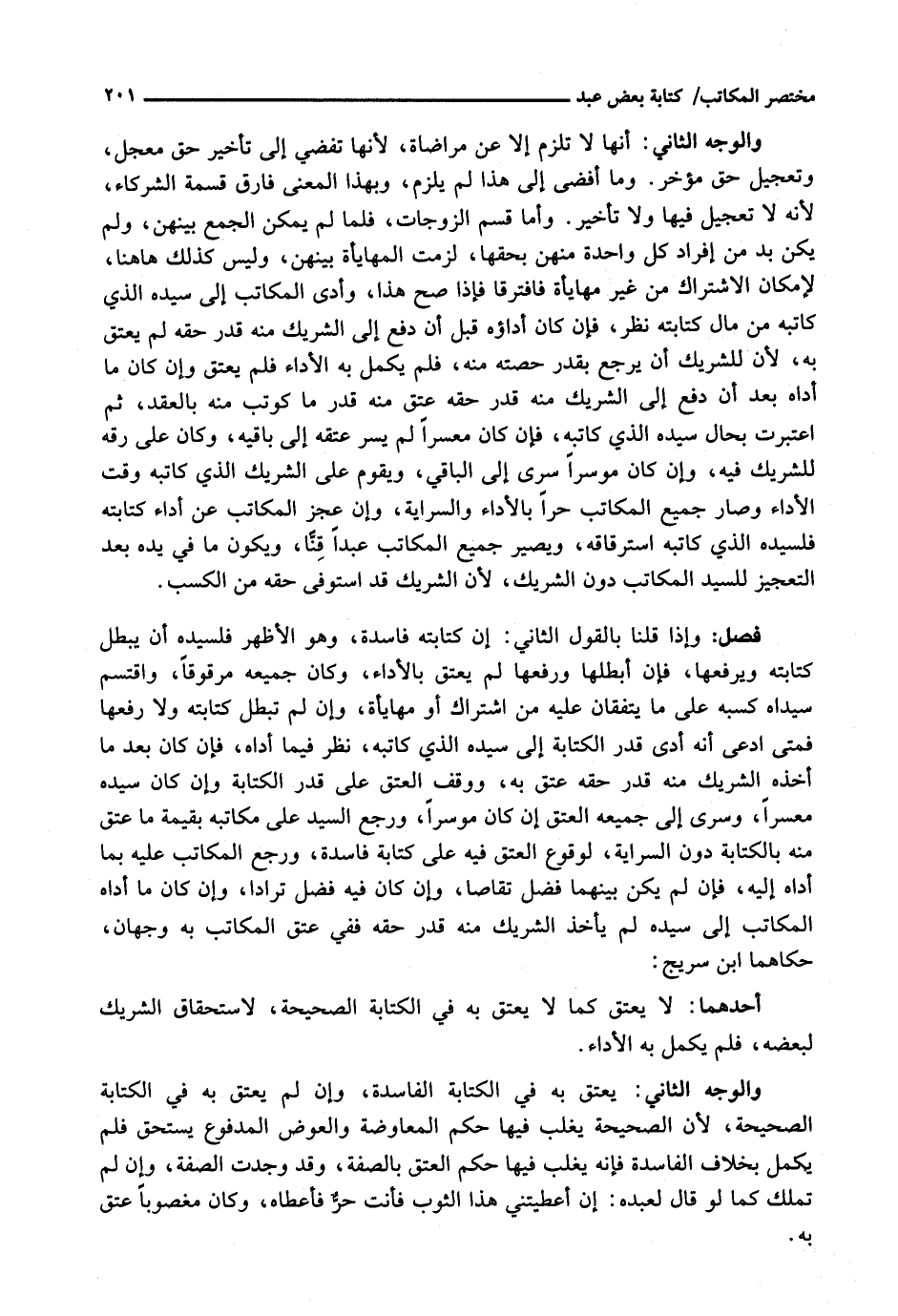 وَالْوَجْهُ الثَّانِي: أَنَّهَا لَا تَلْزَمُ إِلَّا عَنْ مُرَاضَاةٍ، لِأَنَّهَا تُفْضِي إِلَى تَأْخِيرِ حَقٍّ مُعَجَّلٍ، وتعجيل حق موخر. وَمَا أَفْضَى إِلَى هَذَا لَمْ يَلْزَمْ، وَبِهَذَا الْمَعْنَى فَارَقَ قِسْمَةَ الشُّرَكَاءِ، لِأَنَّهُ لَا تَعْجِيلَ فِيهَا وَلَا تَأْخِيرَ. وَأَمَّا قَسْمُ الزَّوْجَاتِ، فَلَمَّا لَمْ يُمْكِنِ الْجَمْعُ بَيْنَهُنَّ، وَلَمْ يَكُنْ بُدٌّ مِنْ إِفْرَادِ كُلِّ وَاحِدَةٍ مِنْهُنَّ بِحَقِّهَا، لَزِمَتِ الْمُهَايَأَةُ بَيْنَهُنَّ، وَلَيْسَ كَذَلِكَ هَاهُنَا، لِإِمْكَانِ الِاشْتِرَاكِ مِنْ غَيْرِ مُهَايَأَةٍ فَافْتَرَقَا فَإِذَا صَحَّ هَذَا، وَأَدَّى الْمُكَاتَبُ إِلَى سَيِّدِهِ الَّذِي كَاتَبَهُ مِنْ مَالِ كِتَابَتِهِ نُظِرَ، فَإِنْ كَانَ أَدَاؤُهُ قَبْلَ أَنْ دَفَعَ إِلَى الشَّرِيكِ مِنْهُ قَدْرَ حَقِّهِ لَمْ يَعْتِقْ بِهِ، لِأَنَّ لِلشَّرِيكِ أَنْ يَرْجِعَ بِقَدْرِ حِصَّتِهِ مِنْهُ، فَلَمْ يَكْمُلْ بِهِ الْأَدَاءُ فَلَمْ يَعْتِقْ وَإِنْ كَانَ مَا أَدَّاهُ بَعْدَ أَنْ دَفَعَ إِلَى الشَّرِيكِ مِنْهُ قَدْرَ حَقِّهِ عتق منه قدر ما كوتب منه بالعتق، ثُمَّ اعْتُبِرَتْ بِحَالِ سَيِّدِهِ الَّذِي كَاتَبَهُ، فَإِنْ كَانَ مُعْسِرًا لَمْ يَسْرِ عِتْقُهُ إِلَى بَاقِيهِ، وَكَانَ عَلَى رِقِّهِ لِلشَّرِيكِ فِيهِ، وَإِنْ كَانَ مُوسِرًا سَرَى إِلَى الْبَاقِي، وَيُقَوَّمُ عَلَى الشَّرِيكِ الَّذِي كَاتَبَهُ وَقْتَ الْأَدَاءِ وَصَارَ جَمِيعُ الْمُكَاتَبِ حُرًّا بِالْأَدَاءِ وَالسِّرَايَةِ، وَإِنْ عَجَزَ الْمُكَاتَبُ عَنْ أَدَاءِ كِتَابَتِهِ فَلِسَيِّدِهِ الَّذِي كَاتَبَهُ اسْتِرْقَاقُهُ، وَيَصِيرُ جَمِيعُ الْمُكَاتَبِ عَبْدًا قِنًّا، وَيَكُونُ مَا فِي يَدِهِ بَعْدَ التَّعْجِيزِ لِلسَّيِّدِ الْمُكَاتَبِ دُونَ الشَّرِيكِ، لِأَنَّ الشَّرِيكَ قَدِ اسْتَوْفَى حَقَّهُ مِنَ الْكَسْبِ.