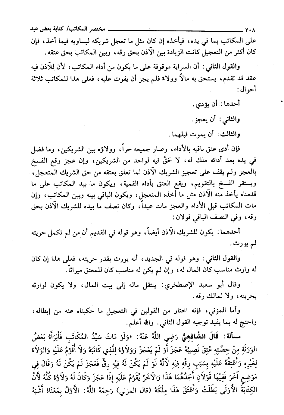 قال الشافعي رضي الله عنه: (وَلَوْ مَاتَ سَيِّدُ الْمُكَاتَبِ فَأَبْرَأَهُ بَعْضُ الْوَرَثَةِ مِنْ حِصَّتِهِ عَتَقَ نَصِيبُهُ عَجَزَ أَوْ لَمْ يَعْجِزْ وَوَلَاؤُهُ لِلَّذِي كَاتَبَهُ وَلَا أُقَوِّمُ عَلَيْهِ وَالْوَلَاءُ لِغَيْرِهِ وَأُعْتِقُهُ عَلَيْهِ بِسَبَبِ رِقِّهِ فِيهِ لِأَنَّهُ لَوْ لَمْ يَكُنْ لَهُ فِيهِ رِقٌّ فَعَجَزَ لَمْ يَكُنْ لَهُ وَقَالَ فِي مَوْضِعٍ آخَرَ فَفِيهَا قَوْلَانِ أَحَدُهُمَا هَذَا وَالْآخَرُ يُقَوَّمُ عليه إذا عجز وكان له ولاؤه كله لأن الكتابة الأولى بطلت واعتق هذا ملكه (قال المزني) رحمه الله: الأول بمعناه أشبه